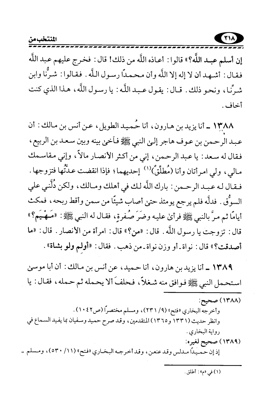 1388- أنا يَزِيدُ بْنُ هَارُونَ، أنا حُمَيْدٌ الطَّوِيلُ، عَنْ أنس عن مَالْكٍ: أَنَّ عَبْدَ الرَّحْمَنِ بْنَ عَوْفٍ هَاجَرَ إِلَى النَّبِيِّ -صَلَّى اللهُ عَلَيْهِ وَسَلَّمَ- فَآخَى بَيْنَهُ وَبَيْنَ سَعْدِ بْنِ الرَّبِيعِ، فَقَالَ لَهُ سَعْدٌ: يَا عَبْدَ الرَّحْمَنِ، إِنِّي مِنْ أَكْثَرِ الْأَنْصَارِ مَالًا، وَإِنِّي مُقَاسِمُكَ مَالِي، وَلِي امْرَأَتَانِ وَأَنَا "مُطَلِّقٌ"1 إِحْدَيْهُمَا؛ فَإِذَا انْقَضَتْ عِدَّتُهَا فَتَزَوَّجْهَا.