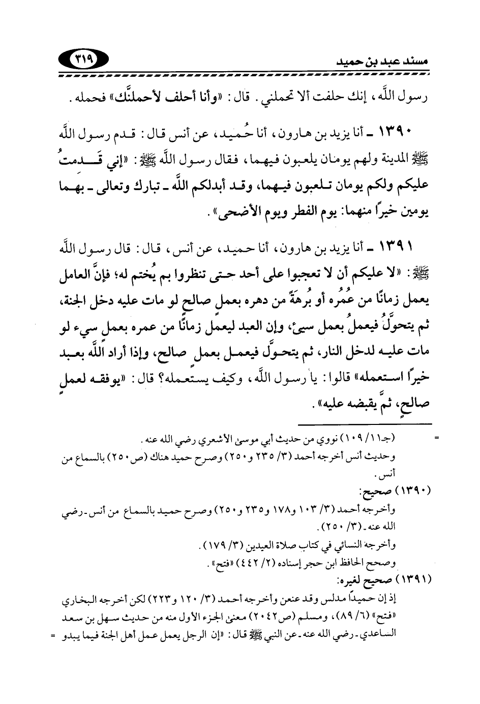 1390- أنا يَزِيدُ بْنُ هَارُونَ، أنا حُمَيْدٌ، عَنْ أَنَسٍ قَالَ: قَدِمَ رَسُولُ اللَّهِ -صَلَّى اللهُ عَلَيْهِ وَسَلَّمَ- الْمَدِينَةَ وَلَهُمْ يَوْمَانِ يَلْعَبُونَ فِيهِمَا، فَقَالَ رَسُولُ اللَّهِ -صَلَّى اللهُ عَلَيْهِ وَسَلَّمَ: "إِنِّي قَدِمْتُ عَلَيْكُمْ وَلَكُمْ يَوْمَانِ تَلْعَبُونَ فِيهِمَا، وَقَدْ أَبْدَلَكُمُ اللَّهُ -تَبَارَكَ وَتَعَالَى- بِهِمَا يَوْمَيْنِ خَيْرًا مِنْهُمَا: يَوْمِ الْفِطْرِ وَيَوْمِ الْأَضْحَى".