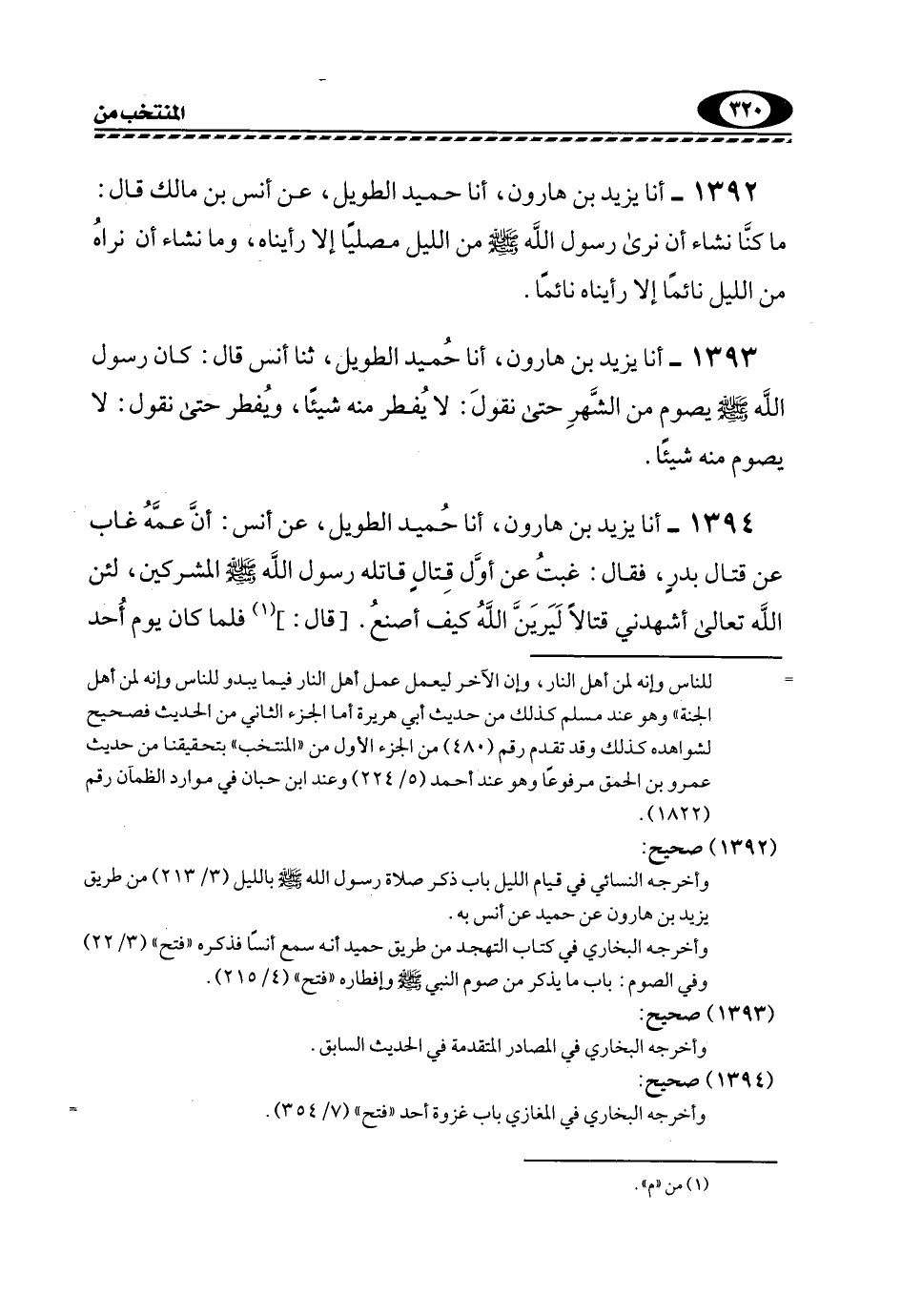 1393- أَنَا يَزِيدُ بْنُ هَارُونَ، أنا حُمَيْدٌ الطَّوِيلُ، ثَنَا أَنَسٌ قَالَ: كَانَ رَسُولُ اللَّهِ -صَلَّى اللهُ عَلَيْهِ وَسَلَّمَ- يَصُومُ مِنَ الشَّهْرِ حَتَّى نَقُولَ: لَا يُفْطِرُ مِنْهُ شَيْئًا، وَيُفْطِرُ حَتَّى نَقُولَ: لَا يَصُومُ مِنْهُ شَيْئًا.