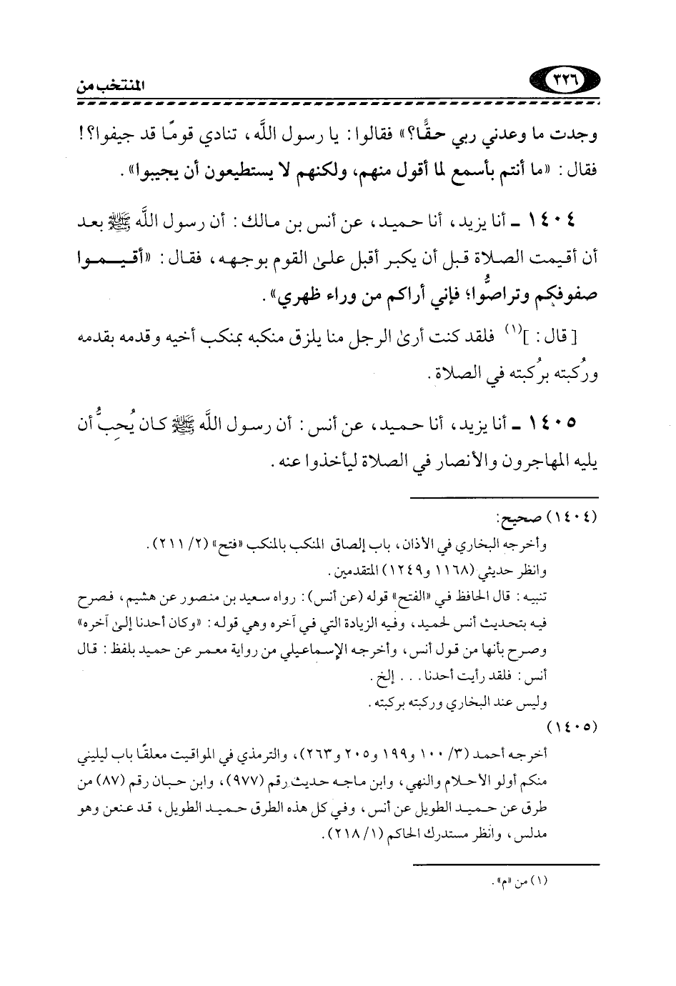 1404- أنا يَزِيدُ، أنا حُمَيْدٌ، عَنْ أَنَسِ بْنِ مَالْكٍ: أَنَّ رَسُولَ اللَّهِ -صَلَّى اللهُ عَلَيْهِ وَسَلَّمَ- بَعْدَ أَنْ أُقِيمَتِ الصَّلَاةُ قَبْلَ أَنْ يُكَبِّرَ أَقْبَلَ عَلَى الْقَوْمِ بِوَجْهِهِ، فَقَالَ: "أَقِيمُوا صُفُوفَكُمْ وَتَرَاصُّوا؛ فَإِنِّي أَرَاكُمْ مِنْ وَرَاءِ ظَهْرِي".