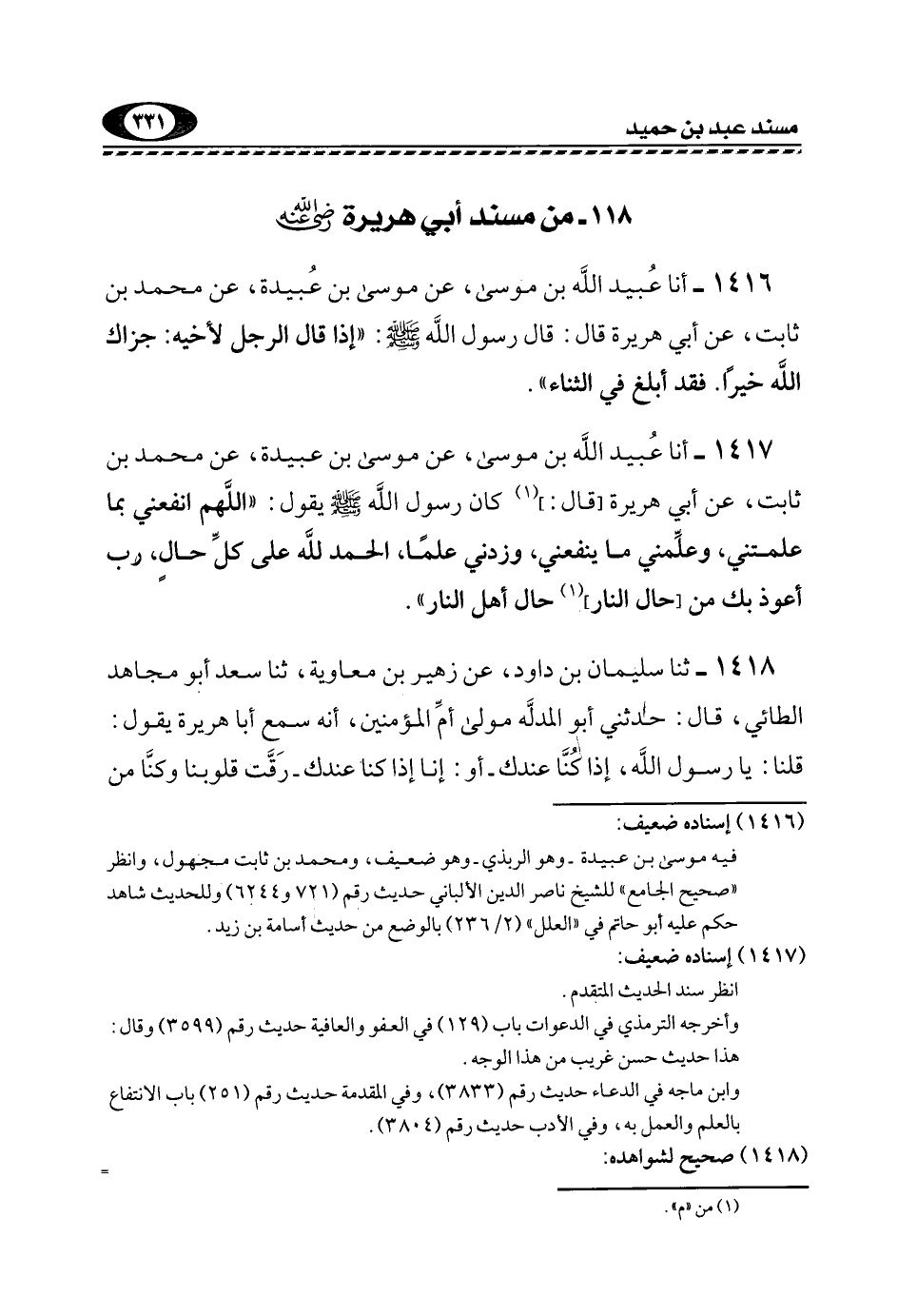 1417- أنا عُبَيْدُ اللَّهِ بْنُ مُوسَى، عَنْ مُوسَى بْنِ عُبَيْدَةَ، عَنْ مُحَمَّدِ بْنِ ثَابِتٍ، عن أبي هريرة [قَالَ:] 1 كَانَ رَسُولُ اللَّهِ -صَلَّى اللهُ عَلَيْهِ وَسَلَّمَ- يَقُولُ: "اللَّهُمَّ انْفَعْنِي بِمَا عَلَّمْتَنِي، وَعَلِّمْنِي مَا يَنْفَعُنِي، وَزِدْنِي عِلْمًا، الْحَمْدُ لِلَّهِ عَلَى كُلِّ حَالٍ، رَبِّ أَعُوذُ بك من [حال النار] 1 حَالِ أَهْلِ النَّارِ".