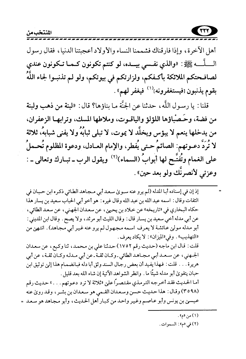 قُلْنَا: يَا رَسُولَ اللَّهِ، حَدِّثْنَا عَنِ الْجَنَّةِ مَا بِنَاؤُهَا؟ قَالَ: "لَبِنَةٌ مِنْ ذَهَبٍ وَلَبِنَةٌ مِنْ فِضَّةٍ، وَحَصْبَاؤُهَا اللُّؤْلُؤُ وَالْيَاقُوتُ، وَمِلَاطُهَا الْمِسْكُ، وَتُرَابُهَا الزَّعْفَرَانُ، من يدخلها ينعم لا يبؤس وَيَخْلُدُ لَا يَمُوتُ، لَا تُبْلَى ثبابه وَلَا يَفْنَى شَبَابُهُ، ثَلَاثَةٌ لَا تُرَدُّ دَعْوتُهُمْ: الصَّائِمُ حَتَّى يُفْطِرَ، وَالْإِمَامُ الْعَادِلُ، وَدَعُوَةُ الْمَظْلُومِ تُحْمَلُ عَلَى الْغَمَامِ وَتُفْتحُ لَهَا أَبْوَابُ "السَّمَاءِ" 2 وَيَقُولُ الرَّبُّ -تَبَارَكَ وَتَعَالَى: وَعِزَّتِي لَأَنْصُرَنَّكَ وَلَوْ بَعْدَ حِينٍ".
