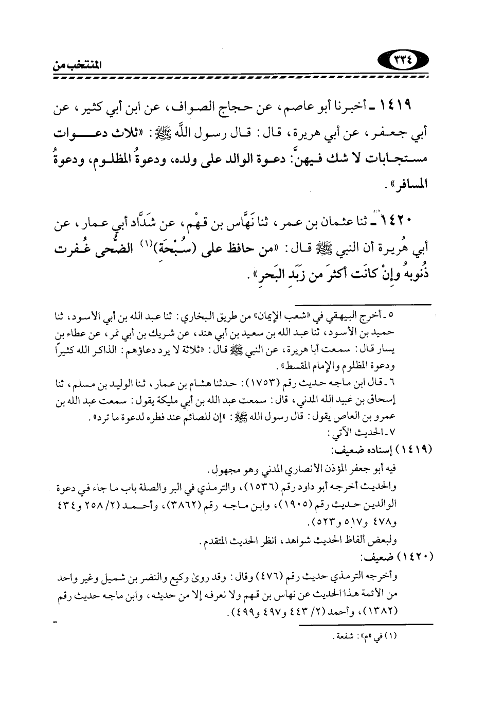 1420- ثنا عُثْمَانُ بْنُ عُمَرَ، ثَنَا نَهَّاسُ بْنُ قَهْمٍ، عَنْ شَدَّادٍ أَبِي عَمَّارٍ، عَنْ أَبِي هُرَيْرَةَ أَنَّ النَّبِيَّ -صَلَّى اللهُ عَلَيْهِ وَسَلَّمَ- قَالَ: "مَنْ حَافَظَ عَلَى "سُبْحَةِ"1 الضُّحَى غُفِرَتْ ذُنُوبُهُ وَإِنْ كَانَتْ أَكْثَرَ مِنْ زبد البحر".