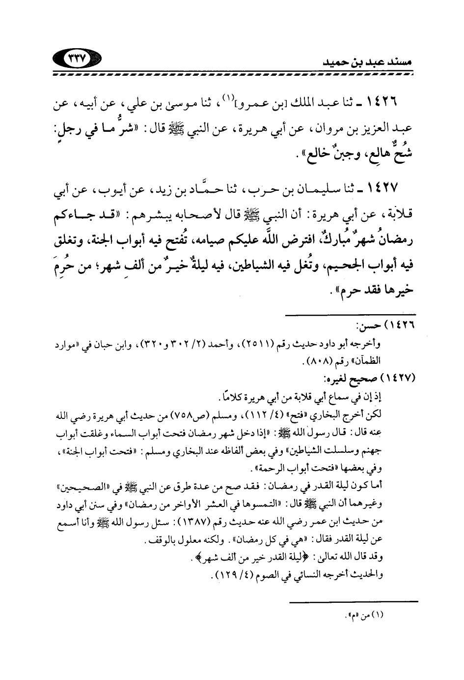 1427- ثنا سُلَيْمَانُ بْنُ حَرْبٍ، ثَنَا حَمَّادُ بْنُ زَيْدٍ، عَنْ أَيُّوبَ، عَنْ أَبِي قِلَابَةَ، عَنْ أَبِي هُرَيْرَةَ: أَنَّ النَّبِيَّ -صَلَّى اللهُ عَلَيْهِ وَسَلَّمَ- قَالَ لِأَصْحَابِهِ يُبَشِّرُهُمْ: "قَدْ جَاءَكُمْ رَمَضَانُ شَهْرٌ مُبَارَكٌ، افْتَرَضَ اللَّهُ عَلَيْكُمْ صِيَامَهُ، تُفْتَحُ فِيهِ أَبْوَابُ الْجَنَّةِ، وَتُغْلَقُ فِيهِ أَبْوَابُ الْجَحِيمِ، وَتُغَلُّ فِيهِ الشَّيَاطِينُ، فِيهِ لَيْلَةٌ خَيْرٌ مِنْ أَلْفِ شَهْرٍ؛ مَنْ حُرِمَ خَيْرُهَا فَقَدْ حُرِمَ".