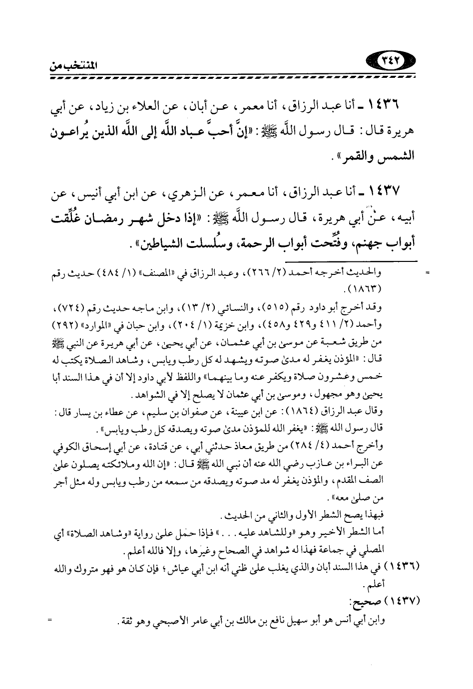 1436- أنا عَبْدُ الرَّزَّاقِ، أنا مَعْمَرٌ، عَنْ أَبَانَ، عَنِ الْعَلَاءِ بْنِ زِيَادٍ، عَنْ أَبِي هُرَيْرَةَ قَالَ: قَالَ رَسُولُ اللَّهِ -صَلَّى اللهُ عَلَيْهِ وَسَلَّمَ: "إِنَّ أَحَبَّ عِبَادِ اللَّهِ إِلَى اللَّهِ الَّذِينَ يُرَاعُونَ الشَّمْسَ وَالْقَمَرَ".