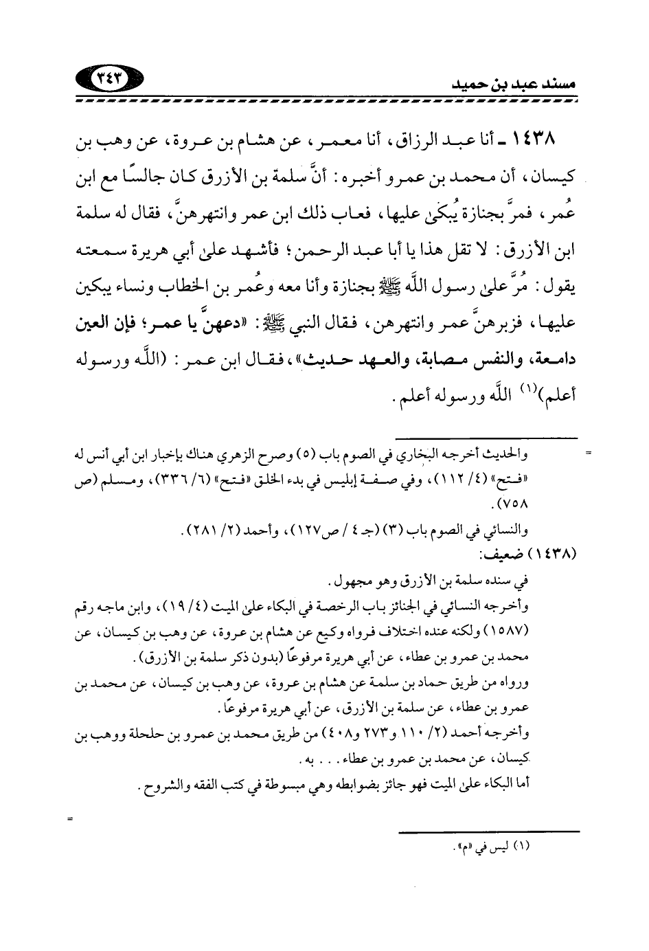 1438- أنا عَبْدُ الرَّزَّاقِ، أنا مَعْمَرٌ، عَنْ هِشَامِ بْنِ عُرْوَةَ، عَنْ وَهْبِ بْنِ كَيْسَانَ، أَنَّ مُحَمَّدَ بْنَ عَمْرٍو أَخْبَرَهُ: أَنَّ سَلَمَةَ بْنَ الْأَزْرَقِ كَانَ جَالِسًا مَعَ ابْنِ عُمَرَ، فَمُرَّ بِجَنَازَةٍ يُبكى عَلَيْهَا، فَعَابَ ذَلِكَ ابْنُ عُمَرَ وَانْتَهَرَهُنَّ، فَقَالَ لَهُ سَلَمَةُ بْنُ الْأَزْرَقِ: لَا تَقُلْ هَذَا يَا أَبَا عَبْدِ الرَّحْمَنِ؛ فَأَشْهَدُ عَلَى أبي هريرة سمعته يَقُولُ: مُرَّ عَلَى رَسُولِ اللَّهِ -صَلَّى اللهُ عَلَيْهِ وَسَلَّمَ- بِجِنَازَةٍ وَأَنَا مَعَهُ وَعُمَرُ بْنُ الْخَطَّابِ وَنِسَاءٌ يَبْكِينَ عَلَيْهَا، فَزَبَرَهُنَّ عُمَرُ وَانْتَهَرَهُنَّ، فَقَالَ النَّبِيُّ -صَلَّى اللهُ عَلَيْهِ وَسَلَّمَ: "دَعْهُنَّ يَا عُمَرُ؛ فَإِنَّ الْعَيْنَ دَامِعَةٌ، وَالنَّفْسُ مُصَابَةٌ، وَالْعَهْدُ حَدِيثٌ"، فَقَالَ ابْنُ عُمَرَ: "اللَّهُ وَرَسُولُهُ أَعْلَمُ"1 اللَّهُ وَرَسُولُهُ أعلم.