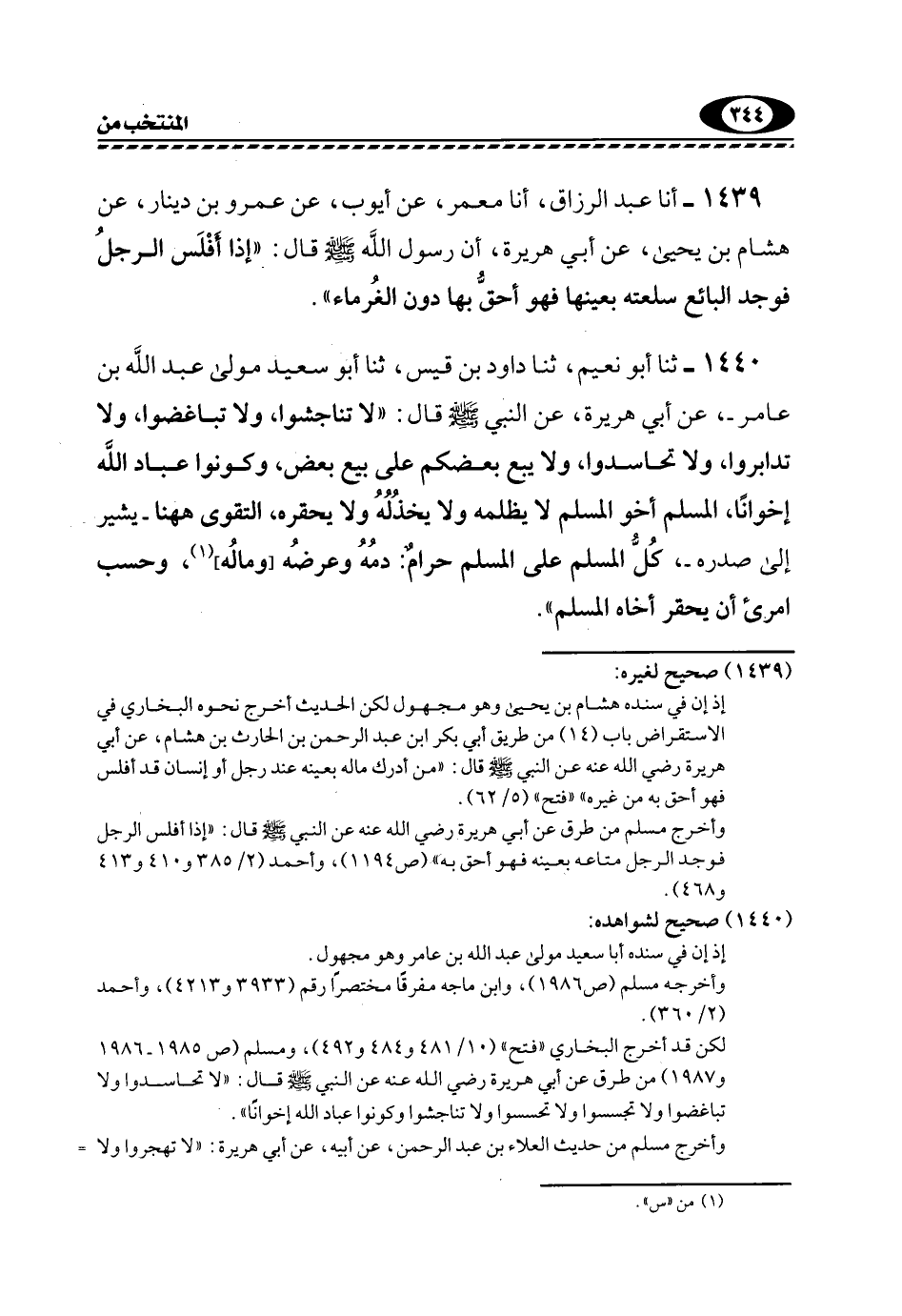 1440- ثنا أَبُو نُعَيْمٍ، ثَنَا دَاوُدُ بْنُ قَيْسٍ، ثَنَا أَبُو سَعِيدٍ مَوْلَى عَبْدِ اللَّهِ بْنُ عَامِرٍ عَنْ أَبِي هُرَيْرَةَ، عَنِ النَّبِيِّ -صَلَّى اللهُ عَلَيْهِ وَسَلَّمَ- قَالَ: "لَا تَنَاجَشُوا، وَلَا تَبَاغَضُوا، وَلَا تَدَابَرُوا، وَلَا تَحَاسَدُوا، وَلَا يَبِعْ بَعْضُكُمْ عَلَى بَيْعِ بَعْضٍ، وَكُونُوا عِبَادَ اللَّهِ إِخْوانًا، الْمُسْلِمُ أَخُو الْمُسْلِمِ لَا يَظْلِمُهُ وَلَا يَخْذُلُهُ وَلَا يَحْقِرُهُ، التَّقْوَى هَاهُنَا -يُشِيرُ إِلَى صَدْرِهِ- كُلُّ الْمُسْلِمِ عَلَى الْمُسْلِمِ حَرَامٌ: دمه وعرضه [وماله] 1، وَحَسْبُ امْرِئٍ أَنْ يَحْقِرَ أَخَاهُ المسلم".