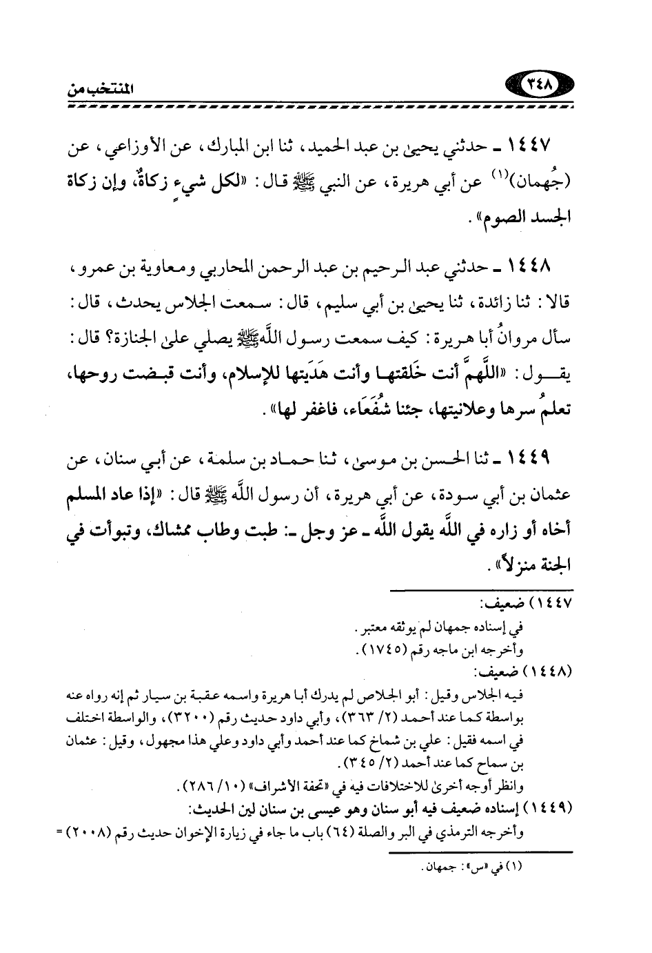 1449- ثنا الْحَسَنُ بْنُ مُوسَى، ثَنَا حَمَّادُ بْنُ سَلَمَةَ، عَنْ أَبِي سِنَانٍ، عَنْ عُثْمَانَ بْنِ أَبِي سَوْدَةَ، عَنْ أَبِي هُرَيْرَةَ، أَنَّ رَسُولَ اللَّهِ -صَلَّى اللهُ عَلَيْهِ وَسَلَّمَ- قَالَ: "إِذَا عَادَ الْمُسْلِمُ أَخَاهُ أَوْ زَارَهُ فِي اللَّهِ يَقُولُ اللَّهُ -عَزَّ وَجَلَّ: طِبْتَ وَطَابَ مَمْشَاكَ، وتبوأت في الجنة منزلا".