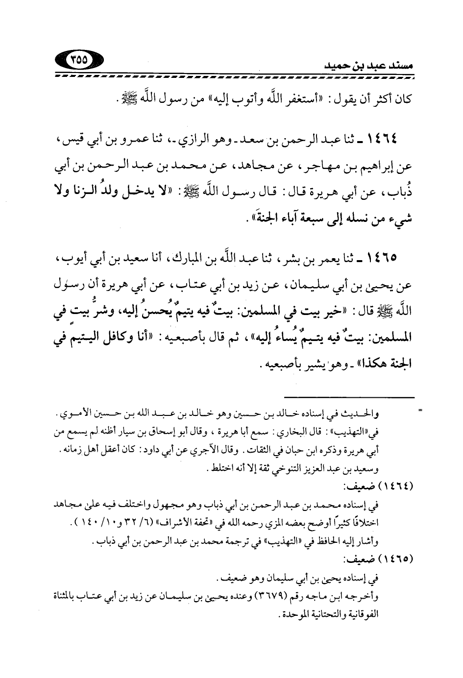 1464- ثنا عَبْدُ الرَّحْمَنِ بْنُ سَعْدٍ -وَهُوَ الرَّازِيُّ- ثَنَا عَمْرُو بْنُ أَبِي قَيْسٍ، عَنْ إِبْرَاهِيمَ بْنِ مُهَاجِرٍ، عَنْ مُجَاهِدٍ، عَنْ مُحَمَّدِ بْنُ عَبْدِ الرَّحْمَنِ بْنِ أَبِي ذُبَابٍ، عَنْ أَبِي هُرَيْرَةَ قَالَ: قَالَ رَسُولُ اللَّهِ -صَلَّى اللهُ عَلَيْهِ وَسَلَّمَ: "لَا يَدْخُلُ وَلَدُ الزِّنَا وَلَا شَيْءٌ مِنْ نَسْلِهِ إِلَى سَبْعَةِ آبَاءٍ الْجَنَّةَ".