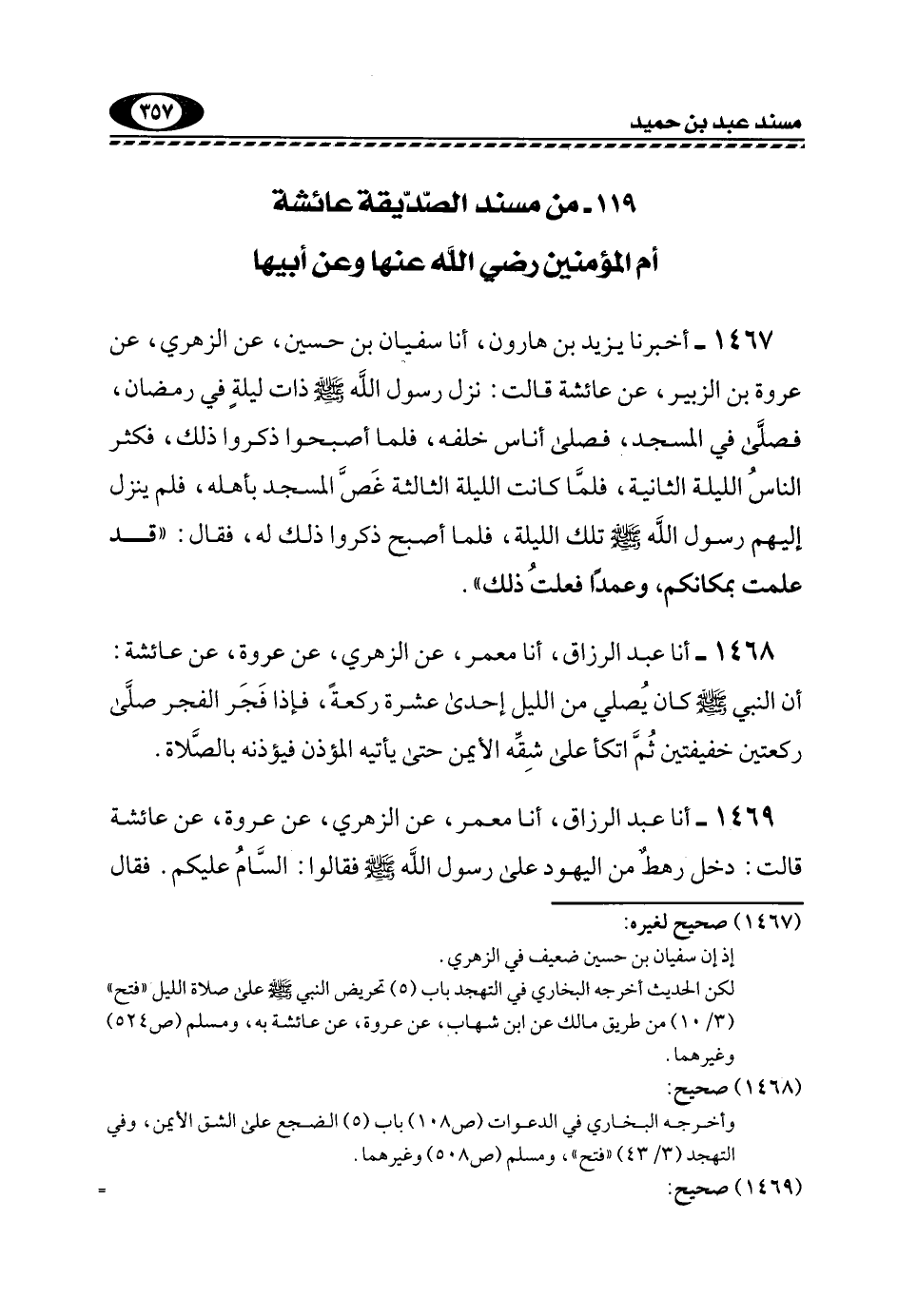 1468- أنا عَبْدُ الرَّزَّاقِ، أنا مَعْمَرٌ، عَنِ الزُّهْرِيِّ، عَنْ عُرْوَةَ، عَنْ عَائِشَةَ: أَنَّ النَّبِيَّ -صَلَّى اللهُ عَلَيْهِ وَسَلَّمَ- كَانَ يُصَلِّي مِنَ اللَّيْلِ إِحْدَى عَشْرَةَ رَكْعَةً، فَإِذَا فَجَرَ الْفَجْرُ صَلَّى رَكْعَتَيْنِ خَفِيفَتَيْنِ ثُمَّ اتَّكَأَ عَلَى شِقِّهِ الْأَيْمَنِ حَتَّى يَأْتِيَهُ الْمُؤَذِّنُ فَيُؤَذِّنَهُ بِالصَّلَاةِ.
