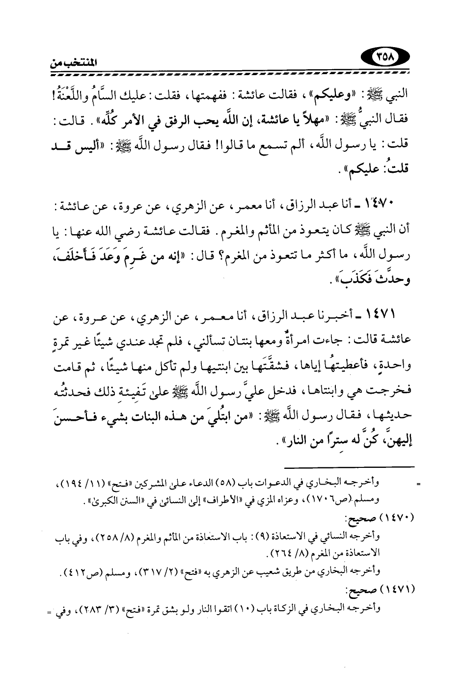 1471- أَخْبَرَنَا عَبْدُ الرَّزَّاقِ، أنا مَعْمَرٌ، عَنِ الزُّهْرِيِّ، عَنْ عُرْوَةَ، عَنْ عَائِشَةَ قَالَتْ: جَاءَتِ امْرَأَةٌ وَمَعَهَا بِنْتَانِ تَسْأَلُنِي، فَلَمْ تَجِدْ عِنْدِي شَيْئًا غَيْرَ تَمْرَةٍ وَاحِدَةٍ، فَأَعْطَيْتُهَا إِيَّاهَا، فَشَقَّتَهَا بَيْنَ ابْنَتَيْهَا، وَلَمْ تَأْكُلْ مِنْهَا شَيْئًا، ثُمَّ قَامَتْ فَخَرَجَتْ هِيَ وَابْنَتَاهَا، فَدَخَلَ عَلَيَّ رَسُولُ اللَّهِ -صَلَّى اللهُ عَلَيْهِ وَسَلَّمَ- عَلَى تَفِيئَةِ ذَلِكَ فَحَدَّثْتُهُ حَدِيثَهَا، فَقَالَ رَسُولُ اللَّهِ -صَلَّى اللهُ عَلَيْهِ وَسَلَّمَ-: "مَنِ ابْتُلِيَ مِنْ هَذِهِ الْبَنَاتِ بِشَيْءٍ فَأَحْسَنَ إِلَيْهِنَّ، كُنَّ لَهُ سترا من النار".
