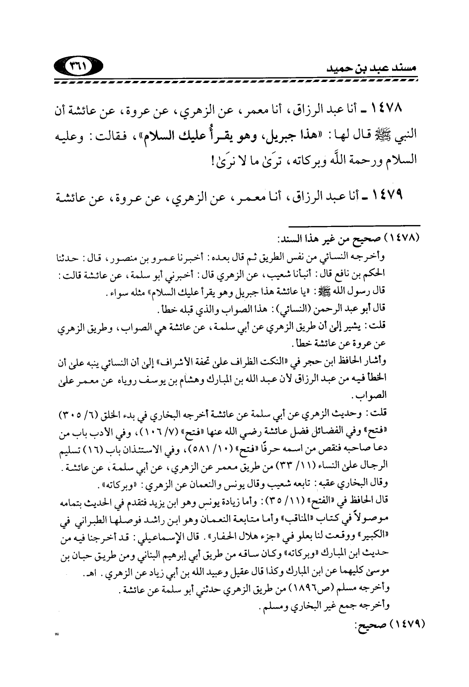 1478- أنا عَبْدُ الرَّزَّاقِ، أنا مَعْمَرٌ، عَنِ الزُّهْرِيِّ، عَنْ عُرْوَةَ، عَنْ عَائِشَةَ أَنَّ النَّبِيَّ -صَلَّى اللهُ عَلَيْهِ وَسَلَّمَ- قَالَ لَهَا: "هَذَا جِبْرِيلُ، وَهُوَ يَقْرَأُ عَلَيْكِ السَّلَامَ"، فَقَالَتْ: وَعَلَيْهِ السَّلَامُ وَرَحْمَةُ اللَّهِ وَبَرَكَاتُهُ، تَرَى مَا لَا نَرَى!