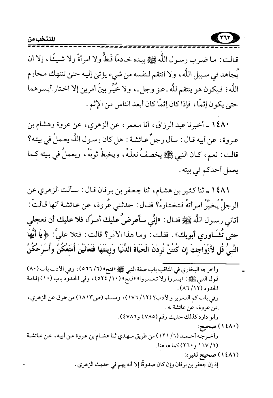 1480- أَخْبَرَنَا عَبْدُ الرَّزَّاقِ، أنا مَعْمَرٌ، عَنِ الزُّهْرِيِّ، عَنْ عُرْوَةَ وَهِشَامُ بْنُ عُرْوَةَ، عَنْ أَبِيهِ قَالَ: سَأَلَ رَجُلٌ عَائِشَةَ: هل كان رسول الله يَعْمَلُ فِي بَيْتِهِ؟ قَالَتْ: نَعَمْ، كَانَ النَّبِيُّ -صَلَّى اللهُ عَلَيْهِ وَسَلَّمَ- يَخْصِفُ نَعْلَهُ، وَيُخِيطُ ثَوْبَهُ، وَيُعْمَلُ فِي بَيْتِهِ كَمَا يَعْمَلُ أَحَدُكُمْ فِي بَيْتِهِ.
