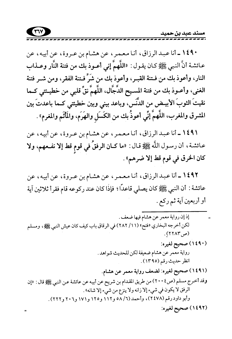 1490- أنا عَبْدُ الرَّزَّاقِ، أنا مَعْمَرٌ، عَنْ هِشَامِ بْنِ عُرْوَةَ، عَنْ أَبِيهِ، عَنْ عَائِشَةَ أَنَّ النَّبِيَّ -صَلَّى اللهُ عَلَيْهِ وَسَلَّمَ- كَانَ يَقُولُ: "اللَّهُمَّ إِنِّي أَعُوذُ بِكَ مِنْ فِتْنَةِ النَّارِ وَعَذَابِ النَّارِ، وَأَعُوذُ بِكَ مِنْ فِتْنَةِ الْقَبْرِ، وَأَعُوذُ بِكَ مِنْ شَرِّ فِتْنَةِ الْفَقْرِ، وَمِنْ شَرِّ فِتْنَةِ الْغِنَى، وَأَعُوذُ بِكَ مِنْ فِتْنَةِ الْمَسِيحِ الدَّجَّالِ، اللَّهُمَّ نَقِّ قَلْبِي مِنْ خَطِيئَتِي كَمَا نَقَّيتَ الثَّوْبَ الْأَبْيَضَ مِنَ الدَّنَسِ، وَبَاعِدْ بَيْنِي وَبَيْنَ خَطِيئَتِي كَمَا بَاعَدْتَ بَيْنَ الْمَشْرِقِ وَالْمَغْرِبِ، اللَّهُمَّ إِنِّي أَعُوذُ بِكَ مِنَ الْكَسَلِ وَالْهَرَمِ، وَالْمَأْثَمِ وَالْمَغْرَمِ".