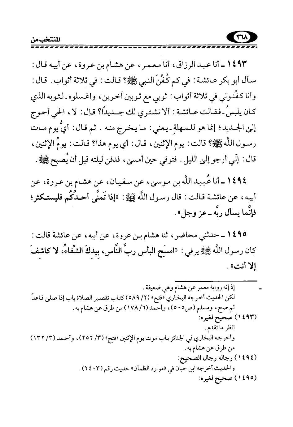 1493- أنا عَبْدُ الرَّزَّاقِ، أنا مَعْمَرٌ، عَنْ هِشَامِ بْنِ عُرْوَةَ، عَنْ أَبِيهِ قَالَ: سَأَلَ أَبُو بَكْرٍ عَائِشَةَ: فِي كَمْ كُفِّنَ النَّبِيُّ -صَلَّى اللهُ عَلَيْهِ وَسَلَّمَ؟ قَالَتْ: فِي ثَلَاثَةِ أَثْوَابٍ. قَالَ: وَأَنَا كَفِّنُونِي فِي ثَلَاثَةِ أَثْوَابٍ: ثَوْبِي مَعَ ثَوْبَيْنِ آخَرَيْنِ، وَاغْسِلُوهُ -لثَوْبِهِ الَّذِي كَانَ يَلْبَسُ- فَقَالَتْ عَائِشَةُ: أَلَا نَشْتَرِي لَكَ جَدِيدًا؟ قَالَ: لَا، الْحَيُّ أَحْوجُ إِلَى الْجَدِيدِ؛ إِنَّمَا هُوَ للمُهْلَةِ -يَعْنِي: مَا يَخْرُجُ مِنْهُ. ثُمَّ قَالَ: أَيُّ يَوْمٍ مَاتَ رَسُولُ اللَّهِ -صَلَّى اللهُ عَلَيْهِ وَسَلَّمَ؟ قَالَتْ: يَوْمَ الِاثْنَيْنِ، قَالَ: أَيُّ يَوْمٍ هَذَا؟ قالت: يوم الاثنين، قال: إني أَرْجُو إِلَى اللَّيْلِ. فَتُوُفِّيَ حِينَ أَمْسَى، فَدُفِنَ لَيْلَتَهُ قَبْلَ أَنْ يُصبح -صَلَّى اللهُ عَلَيْهِ وَسَلَّمَ.
