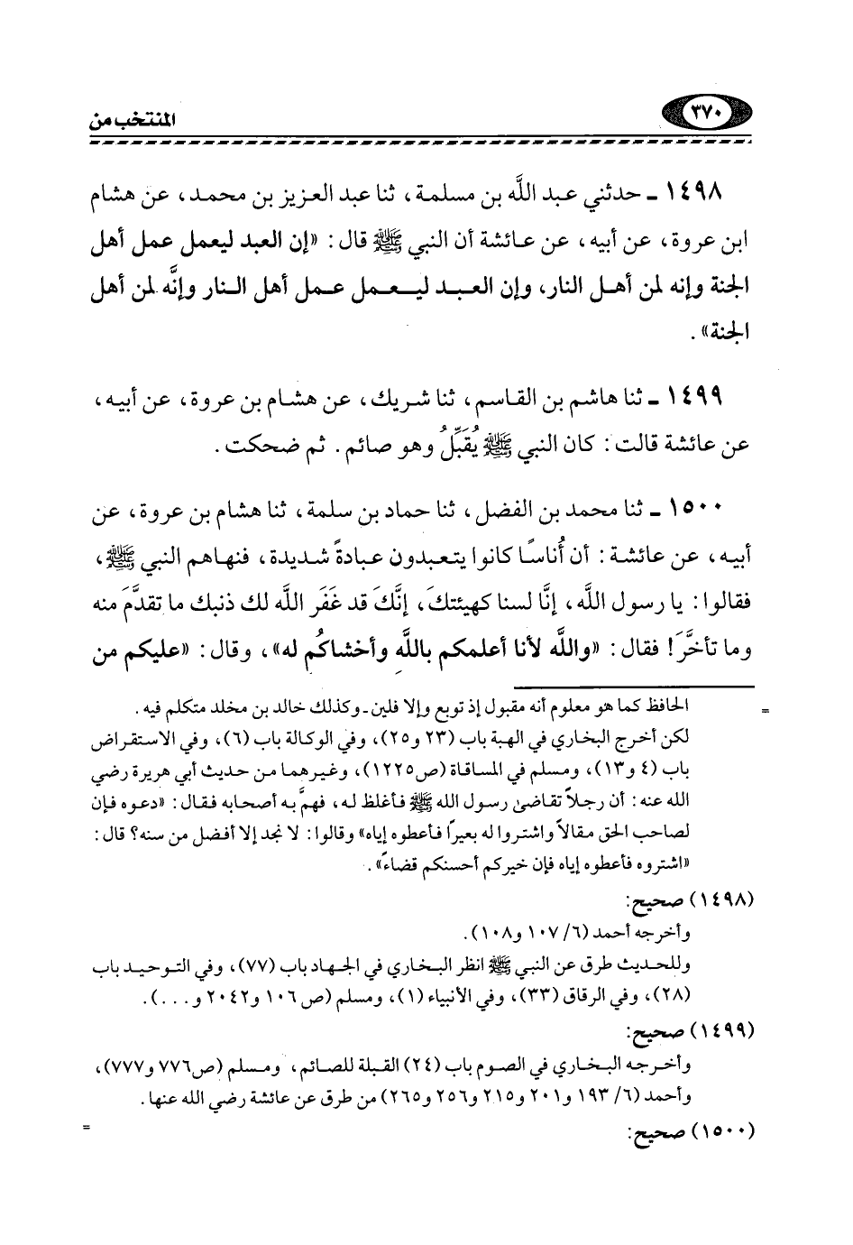 1500- ثنا مُحَمَّدُ بْنُ الْفَضْلِ، ثَنَا حَمَّادُ بْنُ سَلَمَةَ، ثَنَا هِشَامِ بْنِ عُرْوَةَ، عَنْ أَبِيهِ، عَنْ عَائِشَةَ: أَنَّ أَنَاسًا كَانُوا يَتَعَبَّدُونَ عِبَادَةً شَدِيدَةً، فَنَهَاهُمُ النَّبِيُّ -صَلَّى اللهُ عَلَيْهِ وَسَلَّمَ- فَقَالُوا: يَا رَسُولَ اللَّهِ، إَنَّا لَسْنَا كَهَيْئَتِكَ، إِنَّكَ قَدْ غَفَرَ اللَّهُ لَكَ ذَنْبَكَ مَا تَقَدَّمَ مِنْهُ وَمَا تَأَخَّرَ! فَقَالَ: "وَاللهِ لِأَنَا أَعْلَمُكُمْ بِاللَّهِ وَأخْشَاكُمْ لَهُ"، وَقَالَ: "عليكم من