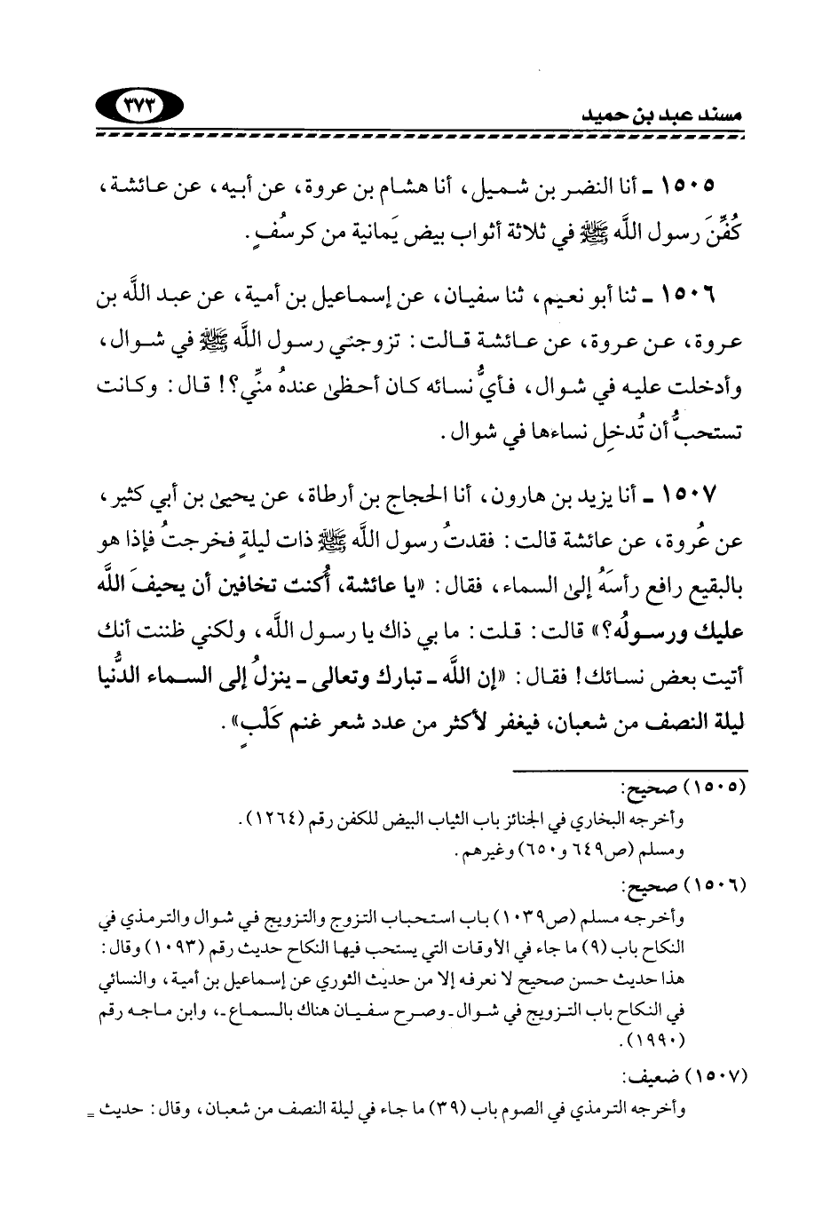 1506- ثنا أَبُو نُعَيْمٍ، ثَنَا سُفْيَانُ، عَنْ إِسْمَاعِيلَ بْنِ أُمَيَّةَ، عَنْ عَبْدِ اللَّهِ بْنِ عُرْوَةَ، عَنْ عُرْوَةَ، عَنْ عَائِشَةَ قَالَتْ: تَزَوَّجَنِي رَسُولُ اللَّهِ -صَلَّى اللهُ عَلَيْهِ وَسَلَّمَ- فِي شَوَّالٍ، وَأُدْخِلْتُ عَلَيْهِ فِي شَوَّالٍ، فَأَيُّ نِسَائِهِ كان أحظى عنده مني؟! قالت: وَكَانَتْ تَسْتَحِبُّ أَنْ تُدخِل نِسَاءَهَا فِي شَوَّالٍ.