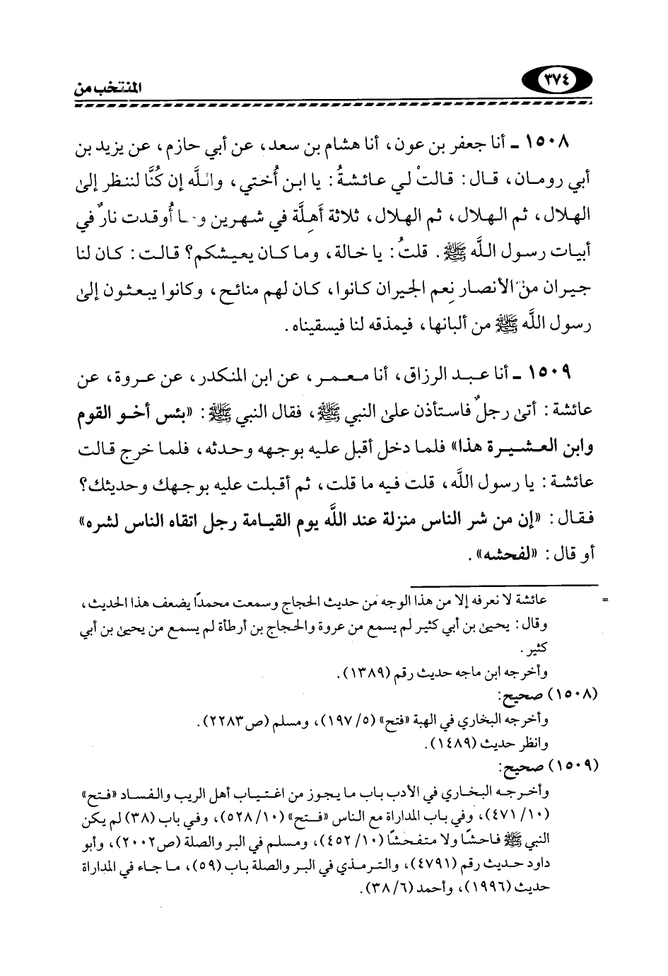 1509- أنا عَبْدُ الرَّزَّاقِ، أنا مَعْمَرٌ، عَنِ ابْنِ الْمُنْكَدِرِ، عَنْ عُرْوَةَ، عَنْ عَائِشَةَ: أَتَى رَجُلٌ فَاسْتَأْذَنَ عَلَى النَّبِيِّ -صَلَّى اللهُ عَلَيْهِ وَسَلَّمَ، فَقَالَ النَّبِيَّ -صَلَّى اللهُ عَلَيْهِ وَسَلَّمَ: "بِئْسَ أَخُو الْقَوْمِ وَابْنُ الْعَشِيرَةِ هَذَا" فَلَمَّا دَخَلَ أَقْبَلَ عَلَيْهِ بِوَجْهِهِ وَحَدَّثَهُ، فَلَمَّا خَرَجَ قَالَتْ عَائِشَةُ: يَا رَسُولَ اللَّهِ، قُلْتَ فِيهِ مَا قُلْتَ، ثُمَّ أَقْبَلْتَ عَلَيْهِ بِوَجْهِكَ وَحَدِيثِكَ؟ فَقَالَ: "إِنَّ مِنْ شَرِّ النَّاسِ مَنْزِلَةً عِنْدَ اللَّهِ يَوْمَ الْقِيَامَةِ رَجُلٌ اتَّقَاهُ النَّاسُ لِشَرِّهِ" أَوْ قَالَ: "لِفُحْشِهِ".