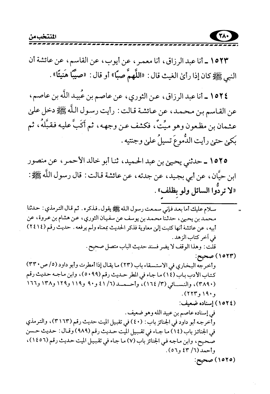 1523- أنا عَبْدُ الرَّزَّاقِ، أنا مَعْمَرٌ، عَنْ أَيُّوبَ، عَنِ الْقَاسِمِ، عَنْ عَائِشَةَ أَنَّ النَّبِيَّ -صَلَّى اللهُ عَلَيْهِ وَسَلَّمَ- كَانَ إِذَا رَأَى الْغَيْثَ قَالَ: "اللَّهُمَّ صَبًّا" أَوْ قَالَ: "صَيِّبًا هَنِيئًا".