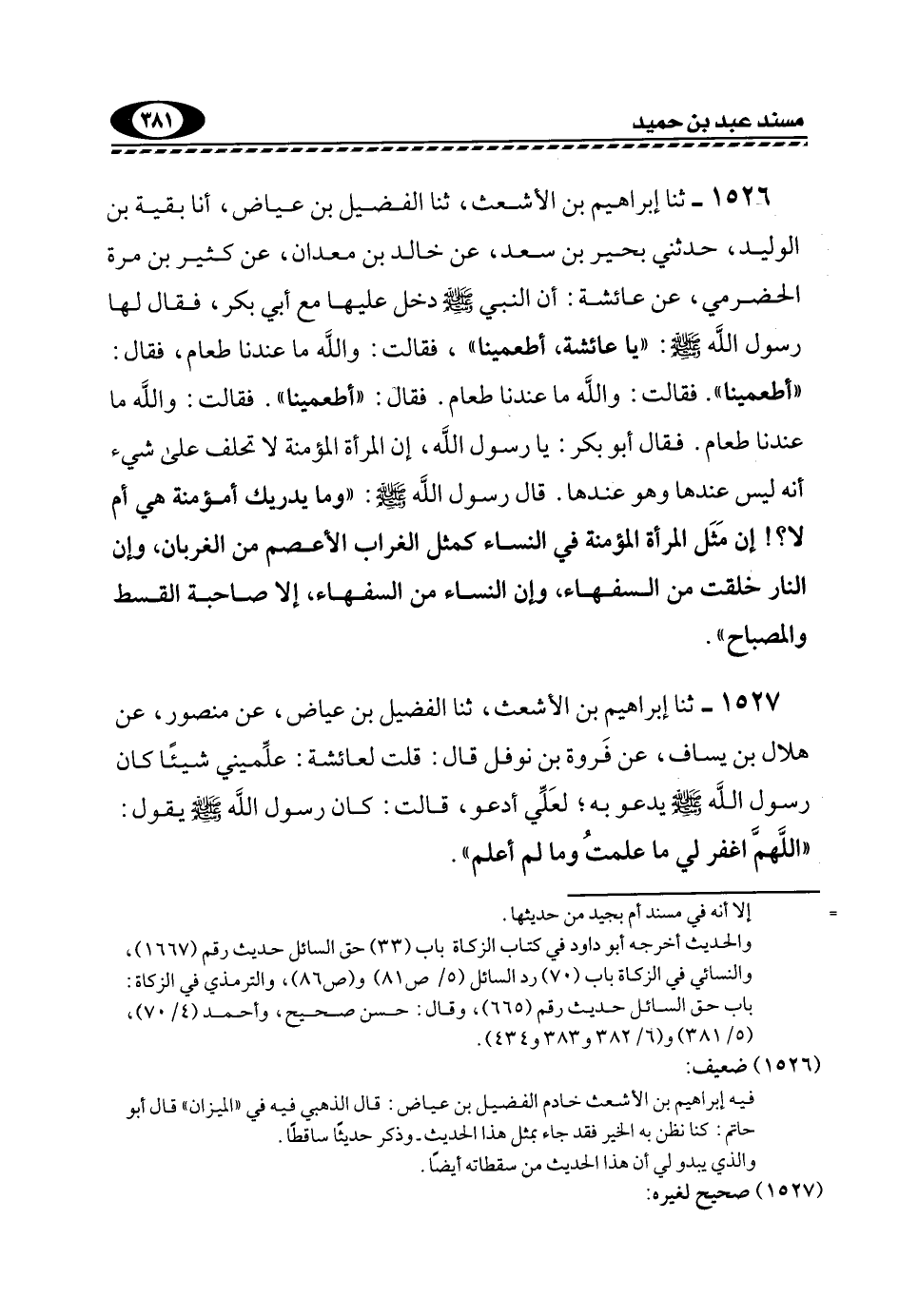 1526- ثنا إِبْرَاهِيمُ بْنُ الْأَشْعَثِ، ثَنَا الْفُضَيْلُ بْنُ عِيَاضٍ، أنا بَقِيَّةُ بْنُ الْوَلِيدِ، حَدَّثَنِي بَحِيرُ بْنُ سَعْدٍ، عَنْ خَالِدِ بْنِ مَعْدَانَ، عَنْ كَثِيرِ بْنِ مُرَّةَ الْحَضْرَمِيِّ، عَنْ عَائِشَةَ: أَنَّ النَّبِيَّ -صَلَّى اللهُ عَلَيْهِ وَسَلَّمَ- دَخَلَ عَلَيْهَا مَعَ أَبِي بَكْرٍ، فَقَالَ لَهَا رَسُولَ اللَّهِ -صَلَّى اللهُ عَلَيْهِ وَسَلَّمَ: "يَا عَائِشَةُ، أَطْعِمِينَا"، فَقَالَتْ: وَاللَّهِ مَا عِنْدَنَا طَعَامٌ، فَقَالَ: "أَطْعِمِينَا". فَقَالَتْ: وَاللَّهِ مَا عِنْدَنَا طَعَامٌ. فَقَالَ: "أَطْعِمِينَا". فَقَالَتْ: وَاللَّهِ مَا عِنْدَنَا طَعَامٌ. فَقَالَ أَبُو بَكْرٍ: يَا رَسُولَ اللَّهِ، إِنَّ الْمَرْأَةَ الْمُؤْمِنَةَ لَا تَحْلِفُ عَلَى شيء أَنَّهُ لَيْسَ عِنْدَهَا وَهُوَ عِنْدَهَا. قَالَ رَسُولُ اللَّهِ -صَلَّى اللهُ عَلَيْهِ وَسَلَّمَ: "وَمَا يُدْرِيكَ أَمُؤْمِنَةٌ هِيَ أَمْ لَا؟! إِنَّ مَثَلَ الْمَرْأَةِ الْمُؤْمِنَةِ فِي النِّسَاءِ كَمَثَلِ الْغُرَابِ الْأَعْصَمِ مِنَ الْغِرْبَانِ، وَإِنَّ النَّارَ خُلِقَتْ مِنَ السُّفَهَاءِ، وَإِنَّ النِّسَاءَ مِنَ السُّفَهَاءِ، إِلَّا صَاحِبَةَ الْقِسْطِ وَالْمِصْبَاحِ".