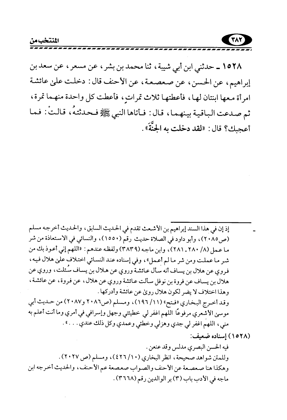 1528- حَدَّثَنِي ابْنُ أَبِي شَيْبَةَ، ثَنَا مُحَمَّدُ بْنُ بِشْرٍ، عَنْ مِسْعَرٍ، عَنْ سَعْدِ بْنِ إِبْرَاهِيمَ، عَنْ الْحَسَنِ، عَنْ صَعْصَعَةَ، عَنِ الْأَحَنْفِ قَالَ: دَخَلَتَ عَلَى عَائِشَةَ امْرَأَةٌ مَعَهَا ابْنَتَانِ لَهَا، فَأَعْطَتْهَا ثَلَاثَ تَمَرَاتٍ، فَأَعْطَتْ كُلَّ وَاحَدَةٍ مِنْهُمَا تَمْرَةً، ثُمَّ صَدَعَتِ الْبَاقِيَةَ بَيْنَهُمَا، قَالَ: فَأَتَاهَا النَّبِيُّ -صَلَّى اللهُ عليه وسلم- فحدثته، قالت: فَمَا أَعْجَبَكَ؟ قَالَ: "لَقَدْ دَخَلَتْ به الجنة".