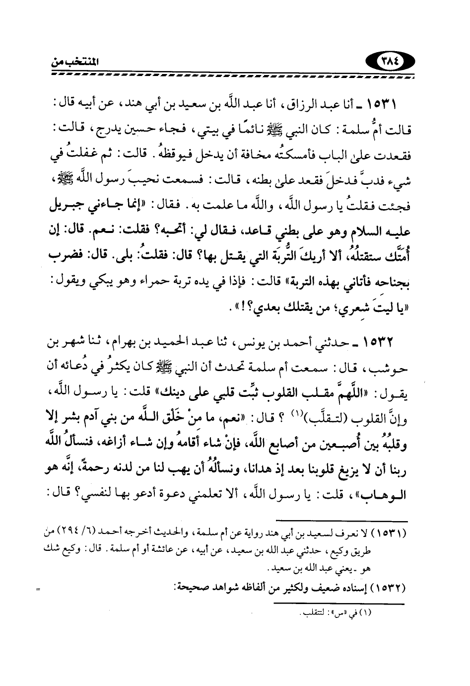 1532- حَدَّثَنِي أَحْمَدُ بْنُ يُونُسَ، ثَنَا عَبْدُ الْحَمِيدِ بْنِ بَهْرَامَ، ثَنَا شَهْرُ بْنُ حَوْشَبٍ، قَالَ: سَمِعْتُ أُمَّ سَلَمَةَ تُحَدِّثُ أَنَّ النَّبِيَّ -صَلَّى اللهُ عَلَيْهِ وَسَلَّمَ- كَانَ يُكْثِرُ فِي دُعَائِهِ أَنْ يَقُولُ: "اللَّهُمَّ مُقَلِّبَ الْقُلُوبِ ثَبِّتْ قَلْبِي عَلَى دِينِكَ" قُلْتُ: يَا رَسُولَ اللَّهِ، وَإِنَّ الْقُلُوبَ "لَتُقَلَّبُ"1؟ قَالَ: "نَعَمْ، مَا مِنْ خَلْقِ اللَّهِ مِنْ بَنِي آدَمَ بَشَرٍ إِلَّا وَقَلْبُهُ بَيْنَ إِصْبُعَيْنِ مِنْ أَصَابِعِ اللَّهِ، فَإِنْ شَاءَ أَقَامَهُ وَإِنْ شَاءَ أَزَاغَهُ، فَنَسْألُ اللَّهَ رَبَّنَا أَنْ لَا يُزِيغَ قُلُوبَنَا بَعْدَ إِذْ هَدَانَا، وَنَسْألُهُ أَنْ يَهَبَ لَنَا مِنْ لَدُنْهُ رَحْمَةً، إِنَّهُ هُوَ الْوَهَّابُ"، قُلْتُ: يَا رَسُولَ اللَّهِ، أَلَا تُعَلِّمُنِي دَعْوَةً أَدْعُو بها لنفسي؟ قال: