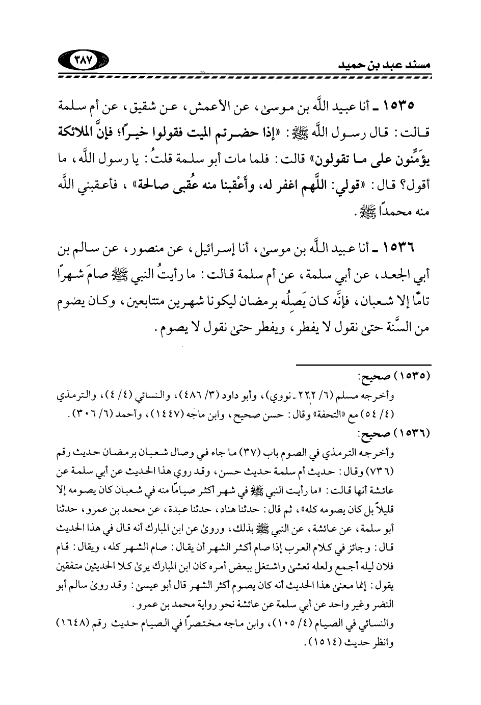 1536- إِنَّا عُبَيْدُ اللَّهِ بْنُ مُوسَى، أنا إِسْرَائِيلُ، عَنْ مَنْصُورٍ، عَنْ سَالِمِ بْنِ أَبِي الْجَعْدِ، عَنْ أَبِي سَلَمَةَ، عَنْ أُمِّ سَلَمَةَ قَالَتْ: مَا رَأَيْتُ النَّبِيَّ -صَلَّى اللهُ عَلَيْهِ وَسَلَّمَ- صَامَ شَهْرًا تَامًّا إِلَّا شَعْبَانَ، فَإِنَّهُ كَانَ يَصِلُهُ بِرَمَضَانَ لِيَكُونَا شَهْرَيْنِ مُتتَابِعَيْنِ، وَكَانَ يَصُومُ مِنَ السَّنَةِ حَتَّى نقُولَ ولا يُفْطِرُ، وَيُفْطِرُ حَتَّى نَقُولَ لَا يصوم.