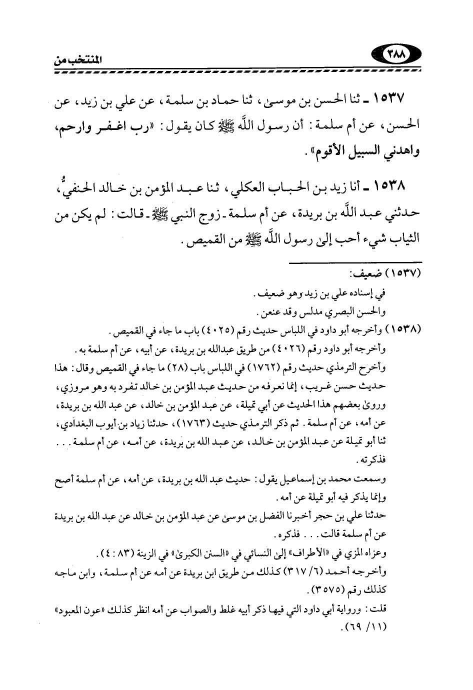 1538- أَنَا زَيْدُ بْنُ الْحُبَابِ الْعُكْلِيُّ، ثَنَا عَبْدُ الْمُؤْمِنِ بْنُ خَالِدٍ الْحَنَفِيُّ، حَدَّثَنِي عَبْدُ اللَّهِ بْنُ بُرَيْدَةَ، عَنْ أُمِّ سَلَمَةَ -زَوْجِ النَّبِيِّ صَلَّى اللهُ عَلَيْهِ وَسَلَّمَ- قَالَتْ: لَمْ يَكُنْ مِنَ الثِّيَابِ شَيْءٌ أَحَبَّ إِلَى رَسُولَ اللَّهِ -صَلَّى اللهُ عَلَيْهِ وسلم- من القميص.