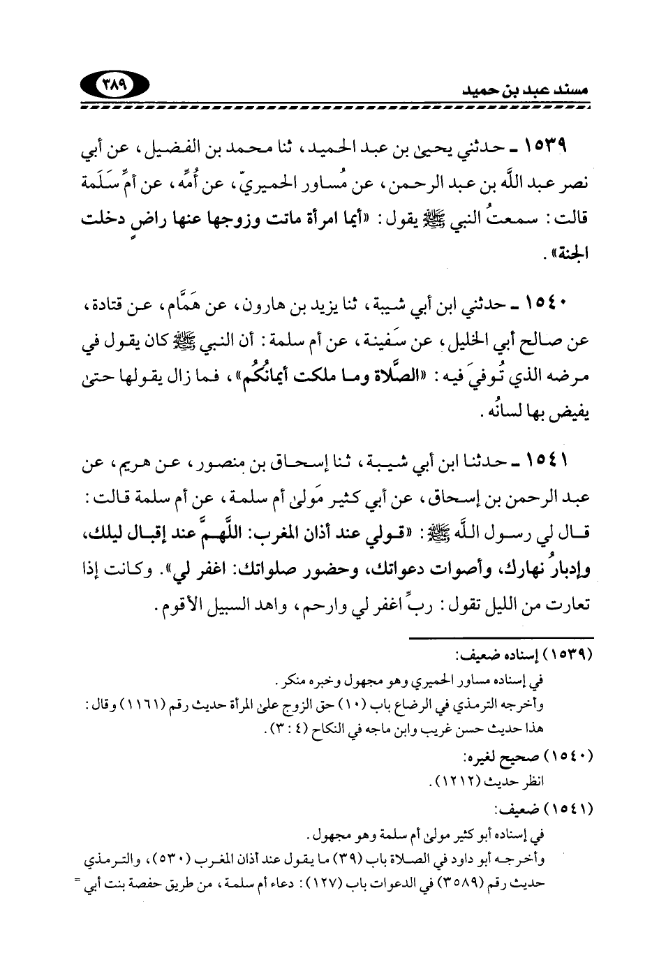1539- حَدَّثَنِي يَحْيَى بْنُ عَبْدِ الْحَمِيدِ، ثَنَا مُحَمَّدُ بْنُ الْفُضَيْلِ، عَنْ أَبِي نَصْرٍ عَبْدِ اللَّهِ بْنِ عَبْدِ الرَّحْمَنِ، عَنْ مُسَاوِرٍ الْحِمْيَرِيِّ، عَنْ أُمِّهِ، عَنْ أُمِّ سَلَمَةَ قَالَتْ: سَمِعْتُ النَّبِيَّ -صَلَّى اللهُ عَلَيْهِ وَسَلَّمَ- يَقُولُ: "أَيُّمَا امْرَأَةٍ مَاتَتْ وَزَوْجُهَا عَنْهَا رَاضٍ دَخَلَتِ الْجَنَّةِ".