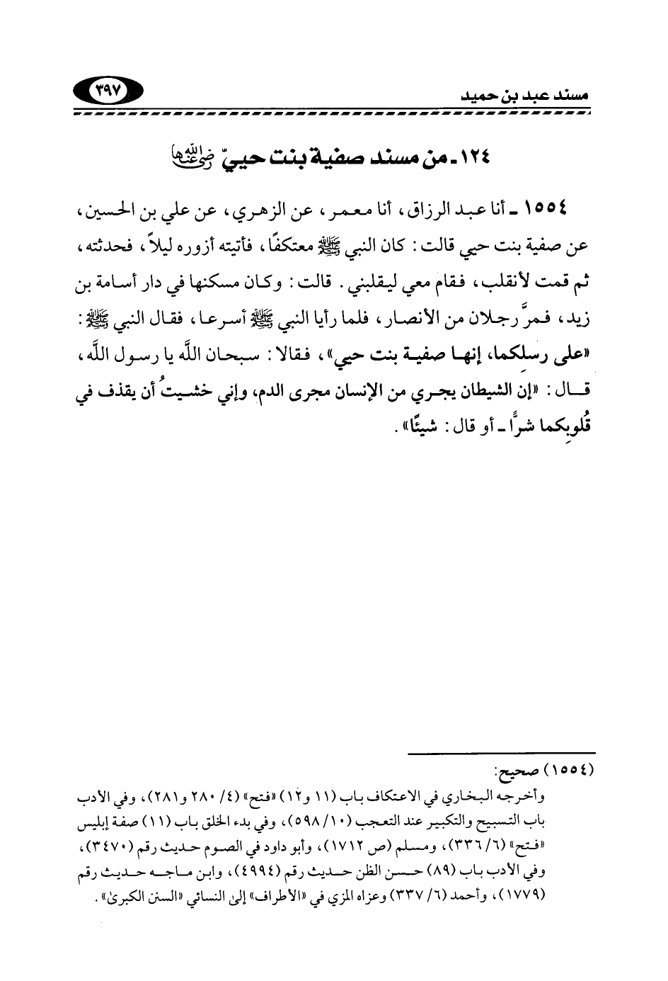 1554- أنا عَبْدُ الرَّزَّاقِ، أنا مَعْمَرٌ، عَنِ الزُّهْرِيِّ، عن علي بن الحسين، عَنْ صَفِيَّةَ بِنْتِ حُيَيٍّ قَالَتْ: كَانَ النَّبِيُّ -صَلَّى اللهُ عَلَيْهِ وَسَلَّمَ- مُعْتَكِفًا، فَأَتَيْتُهُ أَزُورُهُ لَيْلًا، فَحَدَّثْتُهُ، ثُمَّ قُمْتُ لِأَنْقَلِبَ، فَقَامَ مَعِي لِيَقْلِبَنِي. قَالَتْ: وَكَانَ مَسْكَنُهَا فِي دَارِ أُسَامَةَ بْنِ زَيْدٍ، فَمَرَّ رَجُلَانِ مِنَ الْأَنْصَارِ، فَلَمَّا رَأْيَا النَّبِيَّ -صَلَّى اللهُ عَلَيْهِ وَسَلَّمَ- أَسْرَعَا، فَقَالَ النَّبِيُّ -صَلَّى اللهُ عَلَيْهِ وَسَلَّمَ: "عَلَى رِسْلِكُمَا، إِنَّهَا صَفِيَّةُ بِنْتُ حُيَيٍّ"، فَقَالَا: سُبْحَانَ اللَّهِ يَا رَسُولَ اللَّهِ، قال: "إن شيطان يَجْرِي مِنَ الْإِنْسَانِ مَجْرَى الدَّمِ، وَإِنِّي خَشِيتُ أَنْ يَقْذِفَ فِي قُلُوبِكُمَا شَرًّا -أَوْ قَالَ: شَيْئًا-".