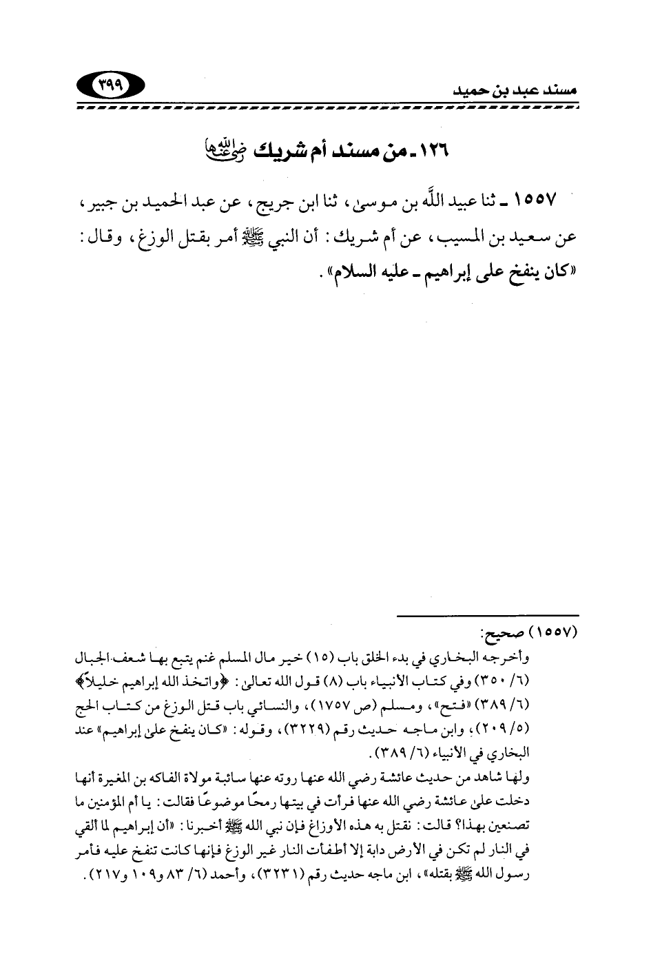 1557- ثنا عُبَيْدُ اللَّهِ بْنُ مُوسَى، ثَنَا ابْنُ جُرَيْجٍ، عَنْ عَبْدِ الْحَمِيدِ بْنِ جُبَيْرٍ، عَنْ سَعِيدِ بْنِ الْمُسَيِّبِ، عَنْ أُمِّ شَرِيكٍ: أَنَّ النَّبِيَّ -صَلَّى اللهُ عَلَيْهِ وَسَلَّمَ- أَمَرَ بِقَتْلِ الْوَزَغِ، وَقَالَ: "كَانَ يَنْفُخُ عَلَى إبراهيم -عليه السلام-".