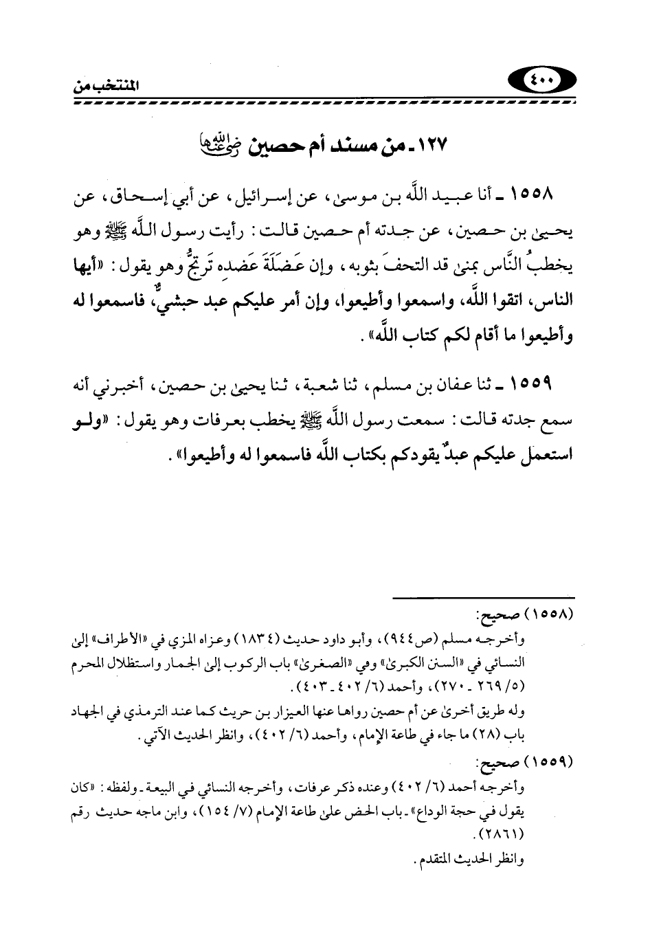 1559- ثنا عَفَّانُ بْنُ مُسْلِمٍ، ثَنَا شُعْبَةُ، ثَنَا يَحْيَى بْنُ حُصَيْنٍ، أَخْبَرَنِي أَنَّهُ سَمِعَ جَدَّتَهُ قَالَتْ: سَمِعْتُ رَسُولَ اللَّهِ -صَلَّى اللهُ عَلَيْهِ وَسَلَّمَ- يَخْطُبُ بِعَرَفَاتٍ وَهُوَ يَقُولُ: "وَلَوِ اسْتُعْمِلَ عَلَيْكُمْ عبدٌ يَقُودُكُمْ بِكِتَابِ اللَّهِ فاسمعوا له وأطيعوا".