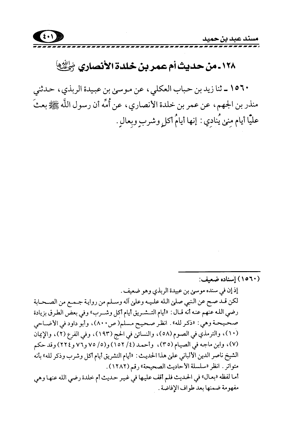 1560- ثَنَا زَيْدُ بْنُ حُبَابٍ الْعُكْلِيُّ، عَنْ مُوسَى بْنِ عُبَيْدَةَ الرَّبَذِيِّ، حَدَّثَنِي مُنْذِرُ بْنُ الْجَهْمِ، عَنْ عُمَرَ بْنِ خَلْدَةَ الْأَنْصَارِيِّ، عَنْ أُمِّهِ أَنَّ رَسُولَ اللَّهِ -صَلَّى اللهُ عَلَيْهِ وَسَلَّمَ- بَعَثَ عَلِيًّا أَيَّامَ مِنًى يُنَادِي: إِنَّهَا أَيَّامُ أكل وشرب وبعال.
