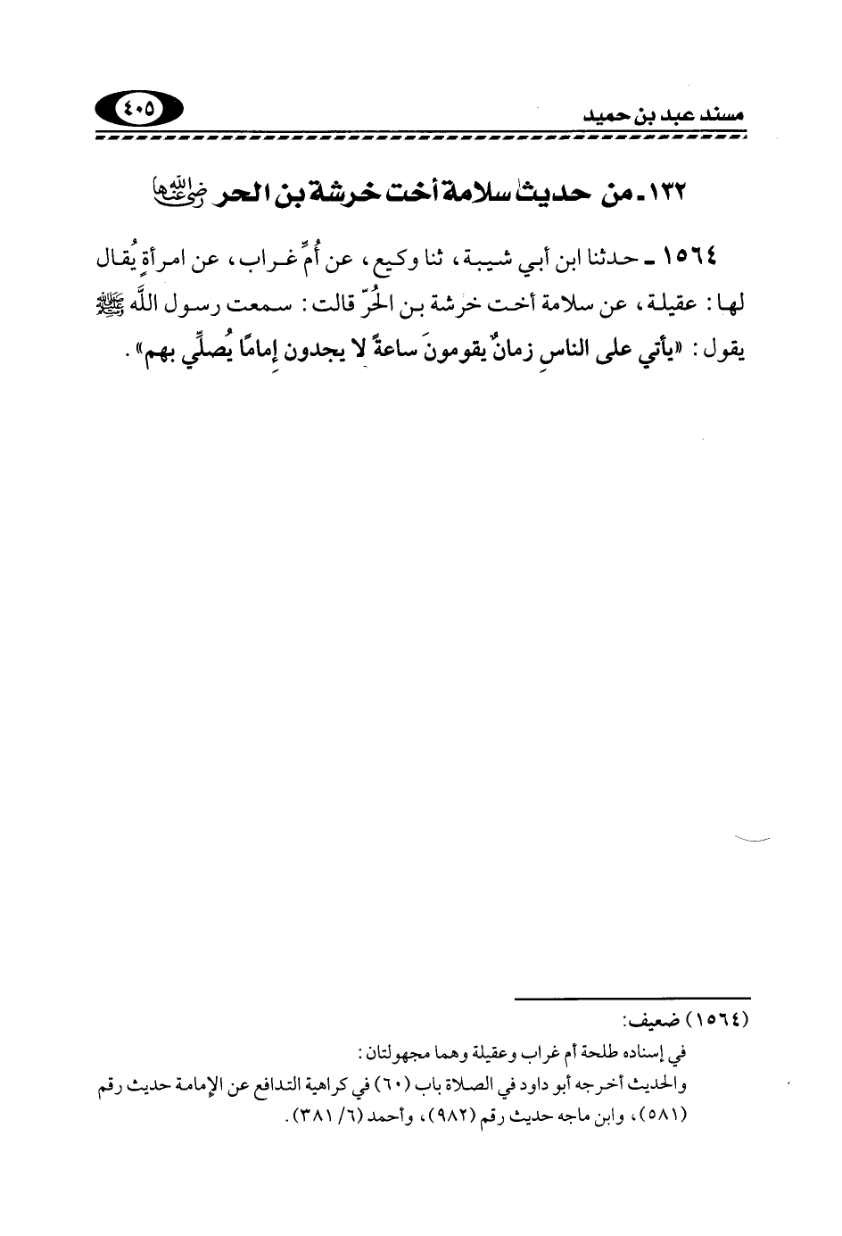 1564- حَدَّثَنَا ابْنُ أَبِي شَيْبَةَ، ثَنَا وَكِيعٌ، عَنْ أُمِّ غُرَابٍ، عَنِ امْرَأَةٍ يُقَالَ لَهَا: عَقِيلَةُ، عَنْ سَلَامَةَ أُخْتِ خَرَشَةَ بْنِ الْحُرِّ قَالَتْ: سَمِعْتُ رَسُولَ اللَّهِ -صَلَّى اللهُ عَلَيْهِ وَسَلَّمَ- يَقُولُ: "يَأْتِي عَلَى النَّاسِ زَمَانٌ يَقُومُونَ سَاعَةً لَا يَجِدُونَ إِمَامًا يُصَلِّي بِهِمْ".