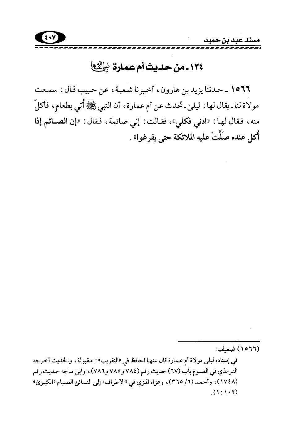 1566- حَدَّثَنَا يَزِيدُ بْنُ هَارُونَ، أَخْبَرَنَا شُعْبَةُ، عَنْ حَبِيبٍ قَالَ: سَمِعْتُ مَوْلَاةً لَنَا -يُقَالَ لَهَا: لَيْلَى- تُحَدِّثُ عَنْ أُمِّ عُمَارَةَ، أَنَّ النَّبِيَّ -صَلَّى اللهُ عَلَيْهِ وَسَلَّمَ- أُتي بِطَعَامٍ، فَأَكَلَ مِنْهُ، فَقَالَ لَهَا: "ادْنِي فَكُلِي"، فَقَالَتْ: إِنِّي صَائِمَةٌ، فَقَالَ: "إِنَّ الصَّائِمَ إِذَا أُكل عِنْدَهُ صَلَّتْ عَلَيْهِ الْمَلَائِكَةُ حتى يفرغوا".