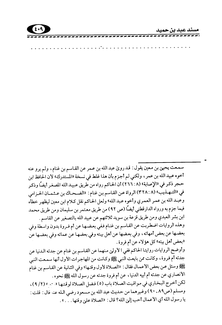 = سمعت يحيى بن معين يقول: قد روى عَبْدُ اللَّهِ بْنُ عُمَرَ عَنْ القاسم بن غنام، ولم يرو عنه أخوه عبيد الله بن عمر، ولكني لم أجزم بأن هذا غلط في نسخة "المستدرك" لأن الحافظ ابن حجر ذكر في "الإصابة" "8: 266" أن الحاكم رواه من طريق عبيد الله المصغر أيضا وذكر في "التهذيب" "8: 328" الرواة عن القاسم بن غنام: "الضحاك بن عثمان الحزامي وعبد الله بن عمر العمري وأخوه عبد الله" ولعل الحاكم نقل كلام ابن معين ليظهر خطأه فيما جزم به ورواه الدارقطني أيضا "ص92" من طريق معتمر بن سليمان ومن طريق محمد بن بشر العبدي ومن طريق قزعة بن سويد ثلاثتهم عن عبيد الله بالتصغير عن القاسم.
