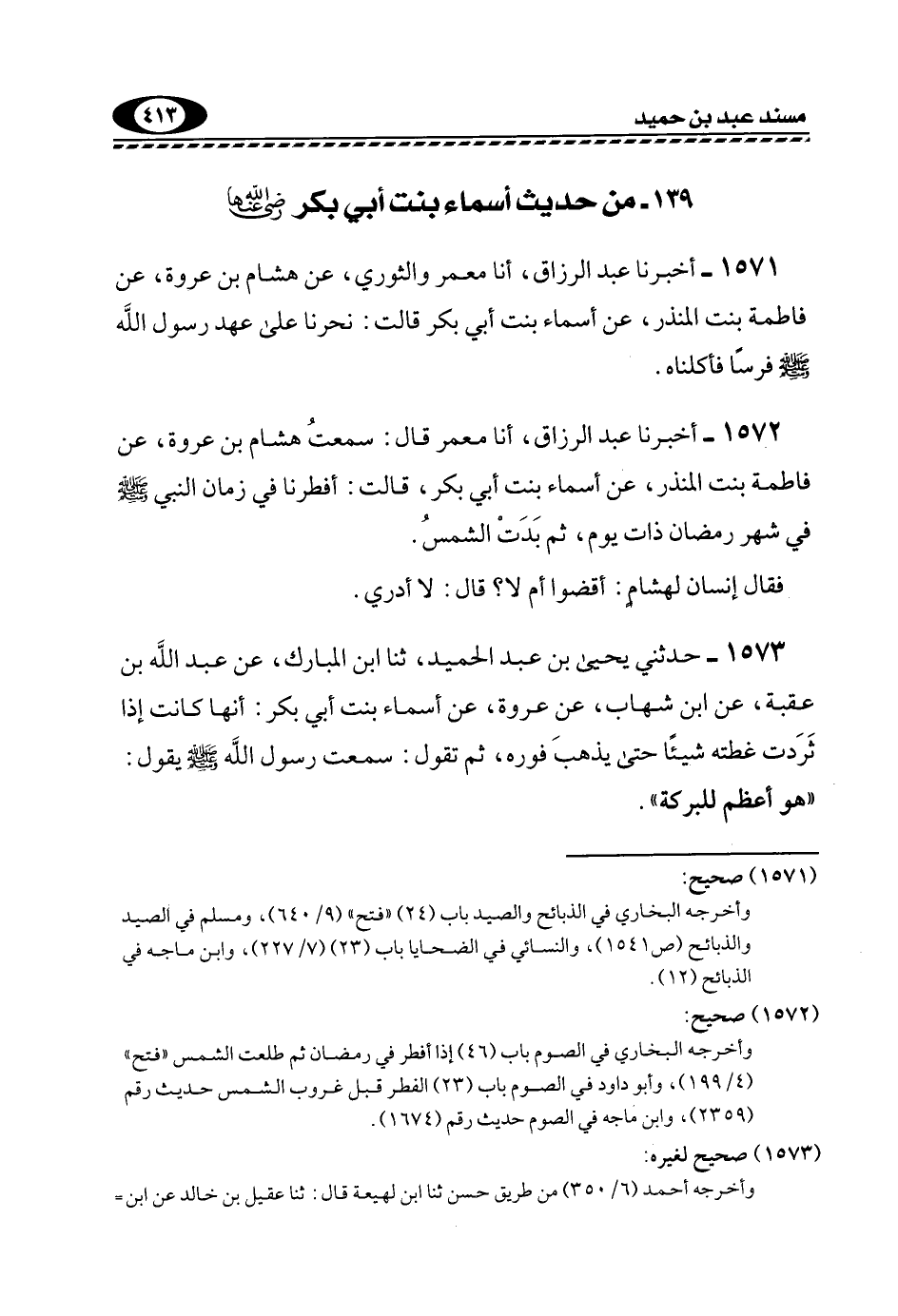 1571- أَخْبَرَنَا عَبْدُ الرَّزَّاقِ، أنا مَعْمَرٌ وَالثَّوْرِيُّ، عَنْ هِشَامِ بْنِ عُرْوَةَ، عَنْ فَاطِمَةَ بِنْتِ الْمُنْذِرِ، عَنْ أَسْمَاءَ بِنْتِ أَبِي بَكْرٍ قَالَتْ: نَحَرْنَا عَلَى عَهْدِ رَسُولِ اللَّهِ -صَلَّى اللهُ عَلَيْهِ وَسَلَّمَ- فَرَسًا فَأَكَلْنَاهُ.