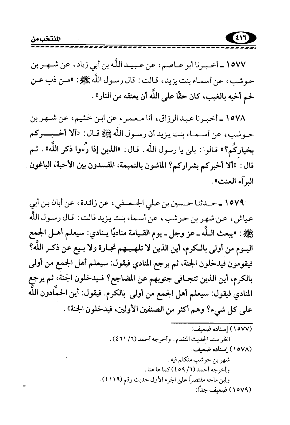 1577- أَخْبَرَنَا أَبُو عَاصِمٍ، عَنْ عُبَيْدِ اللَّهِ بْنِ أَبِي زِيَادٍ، عَنْ شَهْرِ بْنِ حَوْشَبٍ، عَنْ أَسْمَاءَ بِنْتِ يَزِيدَ، قَالَتْ: قَالَ رَسُولُ اللَّهِ -صَلَّى اللهُ عَلَيْهِ وَسَلَّمَ: "مَنْ ذَبَّ عَنْ لَحْمِ أَخِيهِ بِالْغَيْبِ، كَانَ حَقًّا عَلَى اللَّهِ أَنْ يُعْتِقَهُ مِنَ النَّارِ".