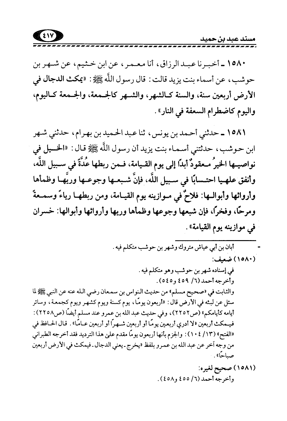 1580- أَخْبَرَنَا عَبْدُ الرَّزَّاقِ، أنا مَعْمَرٌ، عَنِ ابْنِ خُثَيْمٍ، عَنْ شَهْرِ بْنِ حَوْشَبٍ، عَنْ أَسْمَاءَ بِنْتِ يَزِيدَ قَالَتْ: قَالَ رَسُولُ اللَّهِ -صَلَّى اللهُ عَلَيْهِ وَسَلَّمَ: "يَمْكُثُ الدَّجَّالُ فِي الْأَرْضِ أَرْبَعِينَ سَنَةً، وَالسَّنَةُ كَالشَّهْرِ، وَالشَّهْرُ كَالْجُمُعَةِ، وَالْجُمُعَةُ كَالْيَوْمِ، وَالْيَوْمُ كَاضْطِرَامِ السَّعَفَةِ فِي النَّارِ".