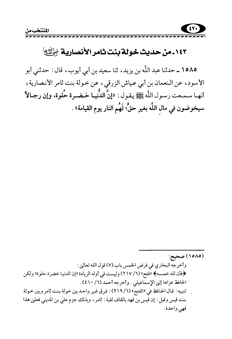 1585- حَدَّثَنَا عَبْدُ اللَّهِ بْنُ يَزِيدَ، ثَنَا سَعِيدُ بْنُ أَبِي أَيُّوبَ، قَالَ: حَدَّثَنِي أَبُو الْأَسْوَدِ، عَنِ النُّعْمَانِ بْنِ أَبِي عَيَّاشٍ الزُّرَقِيِّ، عَنْ خَوْلَةَ بِنْتِ ثَامِرٍ الْأَنْصَارِيَّةِ، أَنَّهَا سَمِعَتْ رَسُولَ اللَّهِ -صَلَّى اللهُ عَلَيْهِ وَسَلَّمَ- يَقُولُ: "إِنَّ الدُّنْيَا خَضِرَةٌ حُلوة، وَإِنَّ رِجَالًا سَيخُوضُونَ فِي مَالِ اللَّهِ بِغَيْرِ حَقٍّ؛ لَهُمُ النَّارُ يَوْمَ الْقِيَامَةِ".