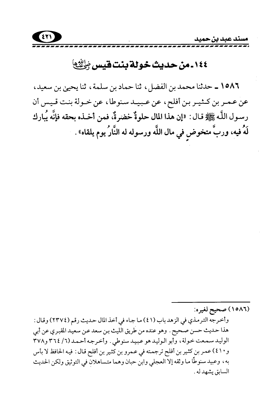 1586- حَدَّثَنَا مُحَمَّدُ بْنُ الْفَضْلِ، ثَنَا حَمَّادُ بْنُ سَلَمَةَ، ثَنَا يَحْيَى بْنُ سَعِيدٍ، عَنْ عُمَرَ بْنِ كَثِيرِ بْنِ أَفْلَحَ، عَنْ عُبَيْدِ سَنُوطَا، عَنْ خَوْلَةَ بِنْتِ قَيْسٍ أَنَّ رَسُولَ اللَّهِ -صَلَّى اللهُ عَلَيْهِ وَسَلَّمَ- قَالَ: "إِنَّ هَذَا الْمَالَ حُلْوَةٌ خَضِرَةٌ، فَمَنْ أَخَذَهُ بِحَقِّهِ فَإِنَّهُ يُبَارَكُ لَهُ فِيهِ، وَرُبَّ مُتَخَوِّضٍ فِي مَالِ اللَّهِ وَرَسُولِهِ لَهُ النَّارُ يَوْمَ يَلْقَاهُ".