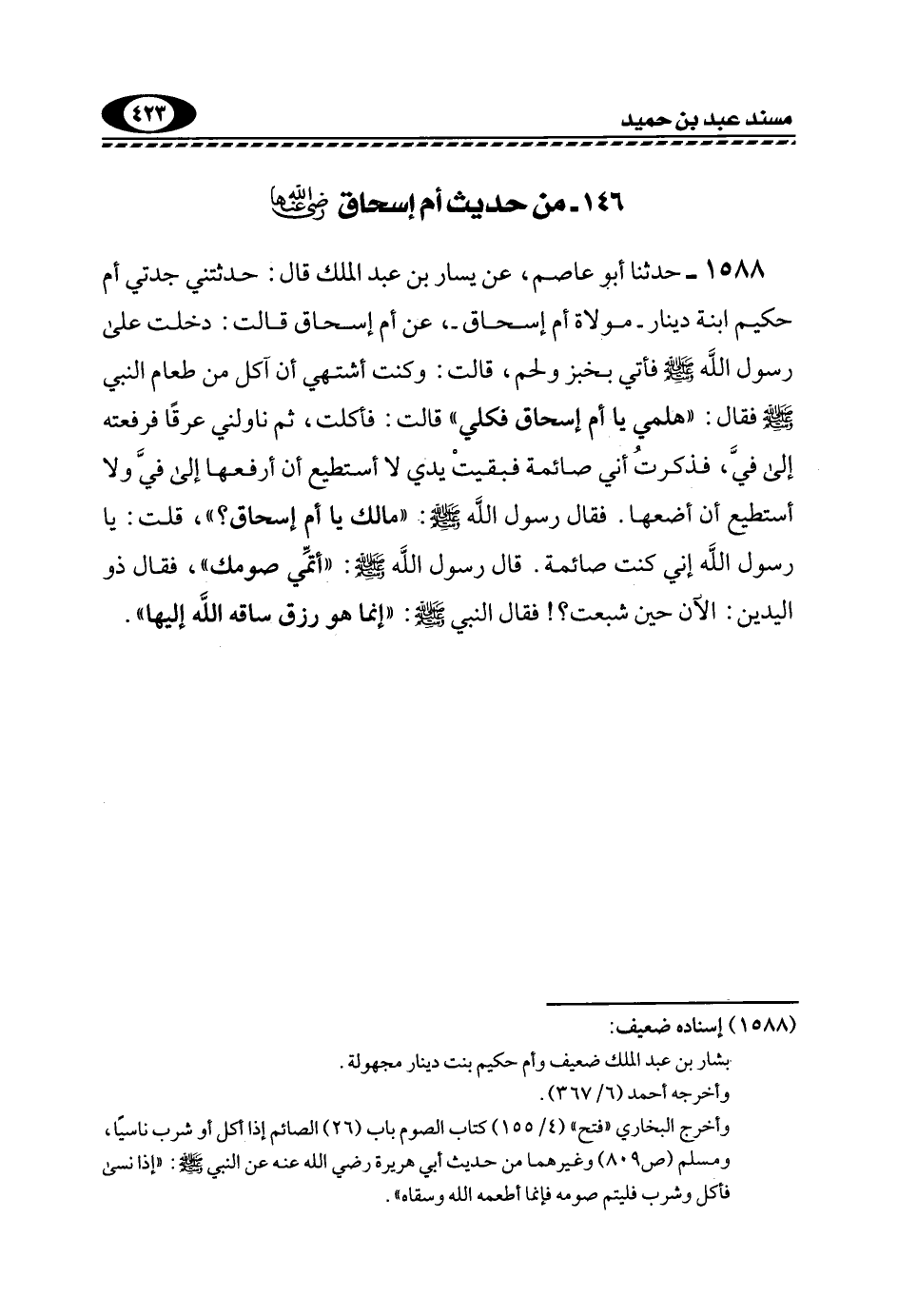 1588- حدثنا أبو عاصم، عن يسار بْنُ عَبْدِ اللَّهِ قَالَ: حَدَّثَنِي جدتي أم حكيم بنة دِينَارٍ -مَوْلَاةُ أُمِّ إِسْحَاقَ- عَنْ أُمِّ إِسْحَاقَ قَالَتْ: دَخَلْتُ عَلَى رَسُولَ اللَّهِ -صَلَّى اللهُ عَلَيْهِ وَسَلَّمَ- فَأُتِيَ بِخُبْزٍ وَلَحْمٍ، قَالَتْ: وَكُنْتُ أَشْتَهِي أَنْ آكُلَ مِنْ طَعَامِ النَّبِيِّ -صَلَّى اللهُ عَلَيْهِ وَسَلَّمَ- فَقَالَ: "هَلُمِّي يَا أُمَّ إِسْحَاقَ فَكُلِي" قَالَتْ: فَأَكَلْتُ، ثُمَّ نَاوَلَنِي عَرْقًا فَرَفَعْتُهُ إِلَى فِيَّ، فَذَكَرْتُ أَنِّي صَائِمَةٌ فَبَقِيتْ يَدِي لَا أَسْتَطِيعُ أَنْ أَرْفَعَهَا إِلَى فِيَّ وَلَا أَسْتَطِيعُ أَنْ أَضَعَهَا. فَقَالَ رَسُولُ اللَّهِ -صَلَّى اللهُ عليه وسلم: "مالك يَا أُمَّ إِسْحَاقَ؟ "، قُلْتُ: يَا رَسُولَ اللَّهِ إِنِّي كُنْتُ صَائِمَةً. قَالَ رَسُولُ اللَّهِ -صَلَّى اللهُ عَلَيْهِ وَسَلَّمَ: "أَتِمِّي صَوْمَكَ"، فَقَالَ ذُو الْيَدَيْنِ: الْآنَ حِينَ شَبِعَتْ؟! فَقَالَ النَّبِيُّ -صَلَّى اللهُ عَلَيْهِ وَسَلَّمَ: "إِنَّمَا هُوَ رِزْقٌ سَاقَهُ الله إليها".