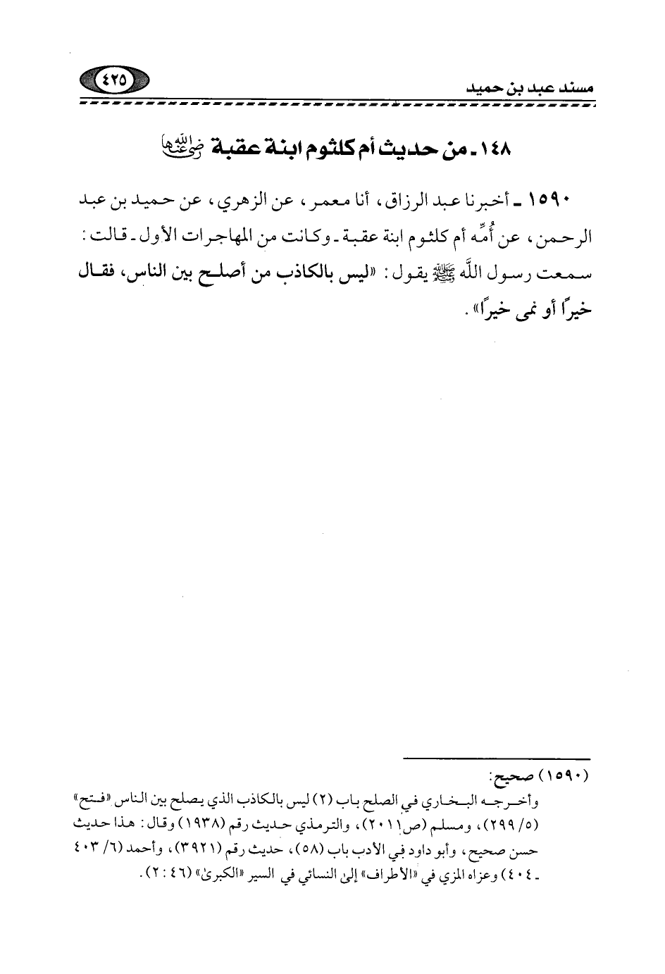 1590- أَخْبَرَنَا عَبْدُ الرَّزَّاقِ، أنا مَعْمَرٌ، عَنِ الزُّهْرِيِّ، عَنْ حُمَيْدِ بْنِ عَبْدِ الرَّحْمَنِ، عَنْ أُمِّهِ أُمِّ كلثوم بنة عُقْبَةَ -وَكَانَتْ مِنَ الْمُهَاجِرَاتِ الْأُوَلِ- قَالَتْ: سَمِعْتُ رَسُولَ اللَّهِ -صَلَّى اللهُ عَلَيْهِ وَسَلَّمَ- يَقُولُ: "لَيْسَ بِالْكَاذِبِ مَنْ أَصْلَحَ بَيْنَ النَّاسِ، فَقَالَ خَيْرًا أَوْ نَمَى خَيْرًا".