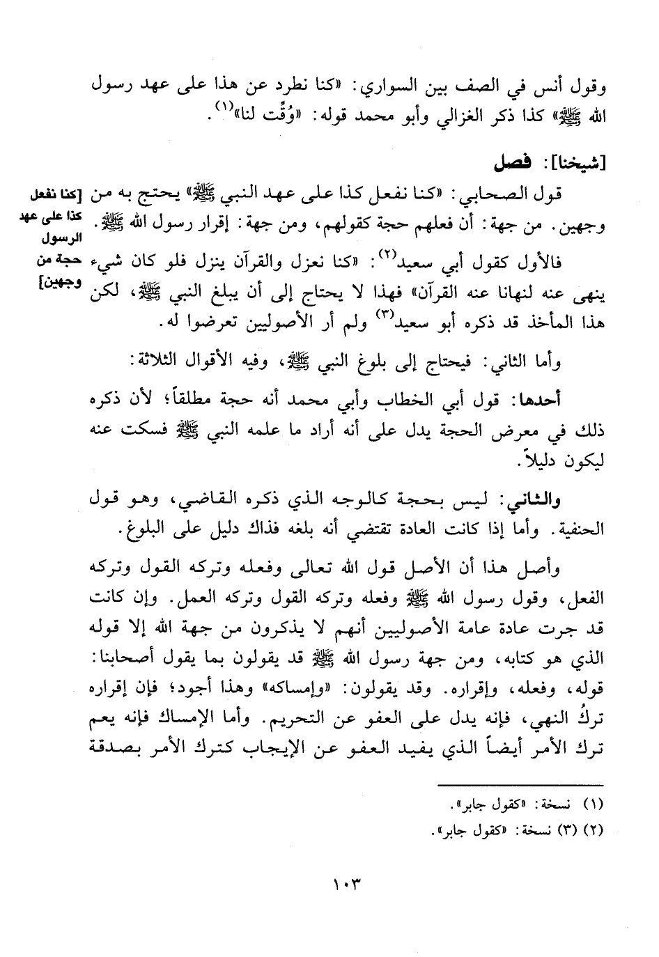 فالأول كقول أبي سعيد (2) : «كنا نعزل والقرآن ينزل فلو كان شيء ينهى عنه لنهانا عنه القرآن» فهذا لا يحتاج إلى أن يبلغ النبي - صلى الله عليه وسلم - لكن هذا المأخذ قد ذكره أبو سعيد (3) ولم أر الأصوليين تعرضوا له.