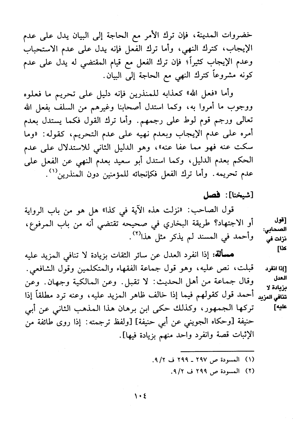 وأما «فعل الله» كعذابه للمنذرين فإنه دليل على تحريم ما فعلوه ووجوب ما أمروا به، وكما استدل أصحابنا وغيرهم من السلف بفعل الله تعالى ورجم قوم لوط على رجمهم. وأما ترك القول فكما يستدل بعدم أمره على عدم الإيجاب وبعدم نهيه على عدم التحريم، كقوله: «وما سكت عنه فهو مما عفا عنه» وهو الدليل الثاني للاستدلال على عدم الحكم بعدم الدليل، وكما استدل أبو سعيد بعدم النهي عن الفعل على عدم تحريمه. وأما ترك الفعل فكإنجائه للمؤمنين دون المنذرين (1) .