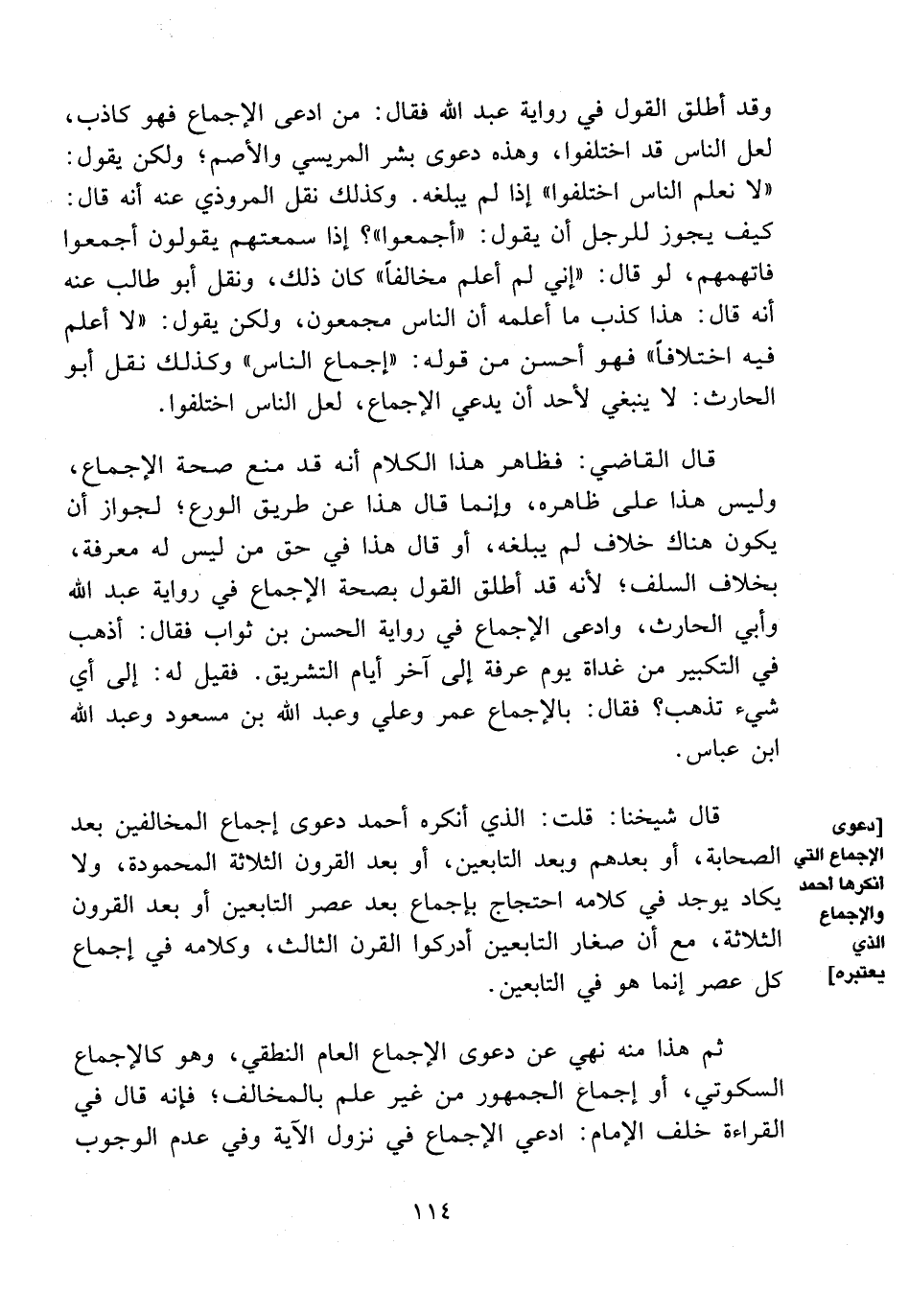 قال شيخنا: قلت: الذي أنكره أحمد دعوى إجماع المخالفين بعد الصحابة أو بعدهم وبعد التابعين، أو بعد القرون الثلاثة المحمودة، ولا يكاد يوجد في كلامه احتجاج بإجماع بعد عصر التابعين أو بعد القرون الثلاثة، مع أن صغار التابعين أدركوا القرن الثالث، وكلامه في إجماع كل عصر إنما هو في التابعين.