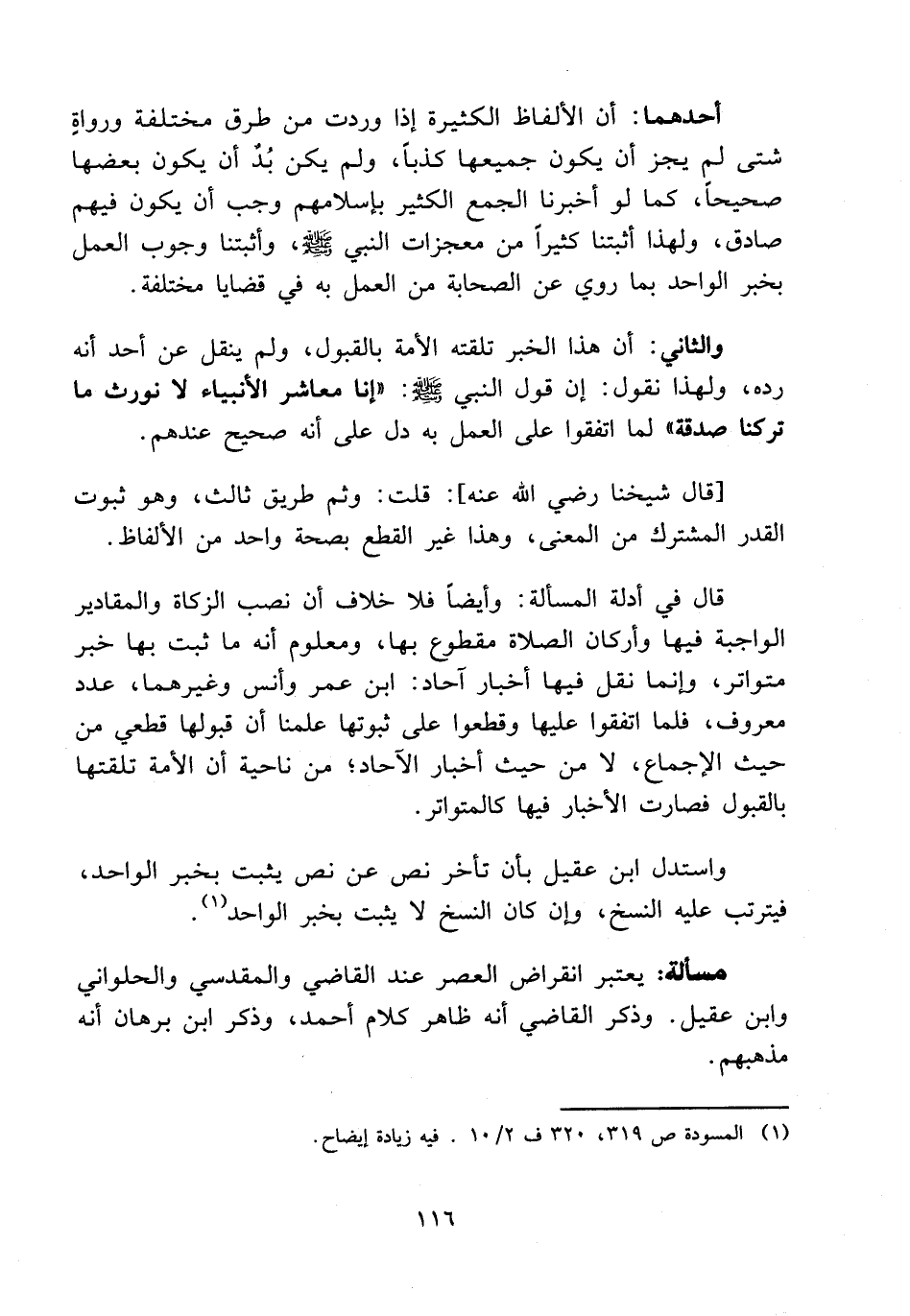 واستدل ابن عقيل بأن تأخر نص عن نص يثبت بخبر الواحد، فيترتب عليه النسخ، وإن كان النسخ لا يثبت بخبر الواحد (1) .