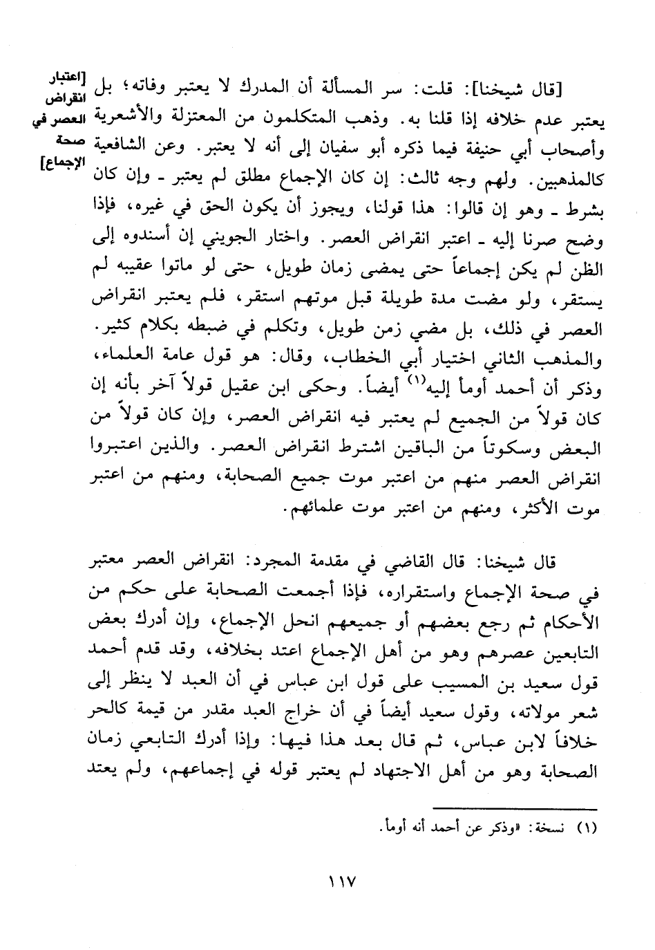 [قال شيخنا] : قلت: سر المسألة أن المدرك لا يعتبر وفاته؛ بل يعتبر عدم خلافه إذا قلنا به. وذهب المتكلمون من المعتزلة والأشعرية وأصحاب أبي حنيفة فيما ذكره أبو سفيان إلى أنه لا يعتبر. وعن الشافعية كالمذهبين، ولهم وجه ثالث: إن كان الإجماع مطلق لم يعتبر -وإن كان بشرط- وهو إن قالوا: هذا قولنا، ويجوز أن يكون الحق في غيره، فإذا وضح صرنا إليه اعتبر انقراض العصر. واختار الجويني إن أسندوه إلى الظن لم يكن إجماعا حتى يمضي زمان طويل حتى لو ماتوا عقبيه لم يستقر ولو مضت مدة طويلة قبل موتهم استقر، فلم يعتبر انقراض العصر في ذلك بل مضى زمن طويل، وتكلم في ضبطه بكلام كثير. والمذهب الثاني اختيار أبي الخطاب، وقال: هو قول عامة العلماء، وذكر أن أحمد أومأ إليه (1) أيضا. وحكى ابن عقيل قولا آخر بأنه إن كان قولا من الجميع لم يعتبر فيه انقراض العصر، وإن كان قولا من البعض وسكوتا من الباقين اشترط انقراض العصر، والذين اعتبروا انقراض العصر منهم من اعتبر موت جميع الصحابة، ومنهم من اعتبر موت الأكثر، ومنهم من اعتبر موت علمائهم.