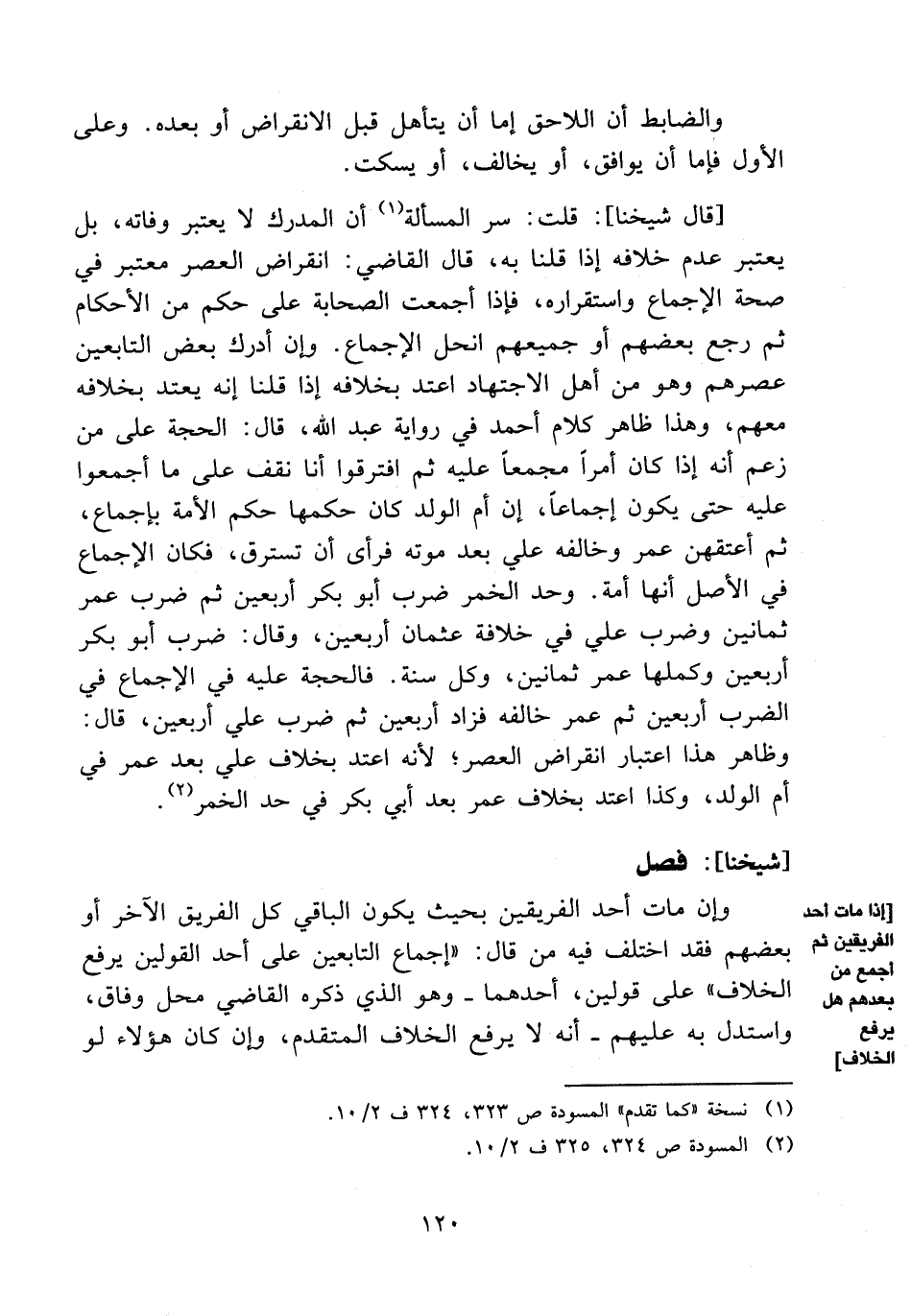 [قال شيخنا] : قلت: سر المسألة (1) أن المدرك لا يعتبر وفاته، بل يعتبر عدم خلافه إذا قلنا به، قال القاضي: انقراض العصر معتبر في صحة الإجماع واستقراره، فإذا أجمعت الصحابة على حكم من الأحكام ثم رجع بعضهم أو جميعهم انحل الإجماع. وإن أدرك بعض التابعين عصرهم وهو من أهل الاجتهاد اعتد بخلافه إذا قلنا إنه يعتد بخلافه معهم، وهذا ظاهر كلام أحمد في رواية عبد الله، قال: الحجة على من زعم أنه إذا كان أمرا مجمعا عليه ثم افترقوا أنا نقف على ما أجمعوا عليه حتى يكون إجماعا، إن أم الولد كان حكمها حكم الأمة بإجماع، ثم أعتقهن عمر وخالفه علي بعد موته فرأى أن تسترق فكان الإجماع في الأصل أنها أمة. وحد الخمر ضرب أبو بكر أربعين ثم ضرب عمر ثمانين وضرب علي في خلافة عثمان أربعين، وقال: ضرب أبو بكر أربعين وكملها عمر ثمانين، وكل سنة. فالحجة عليه في الإجماع في الضرب أربعين ثم عمر خالفه فزاد أربعين ثم ضرب علي أربعين، قال: وظاهر هذا اعتبار انقراض العصر؛ لأنه اعتد بخلاف علي بعد عمر في أم الولد، وكذا اعتد بخلاف عمر بعد أبي بكر في حد الخمر (2) .