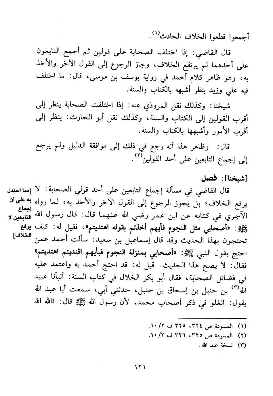 قال القاضي في مسألة إجماع التابعين على أحد قولي الصحابة: لا يرفع الخلاف؛ بل يجوز الرجوع إلى القول الآخر والأخذ به، لما رواه الآجري في كتابه عن ابن عمر رضي الله عنهما قال: قال رسول الله - صلى الله عليه وسلم -: «أصحابي مثل النجوم فأيهم أخذتم بقوله اهتديتم» ، فقيل له: كيف تحتجون بهذا الحديث وقد قال إسماعيل بن سعيد: سألت أحمد عمن احتج بقول النبي - صلى الله عليه وسلم -: «أصحابي بمنزلة النجوم فبأيهم اقتديتم اهتديتم» فقال: لا يصح هذا الحديث؟ قيل له: قد احتج أحمد به واعتمد عليه في فضائل الصحابة، فقال أبو بكر الخلال في كتاب السنة: أنبأنا عبيد الله (3) بن حنبل بن إسحاق بن حنبل، حدثني أبي، سمعت أبا عبد الله يقول: الغلو في ذكر أصحاب محمد لأن رسول الله - صلى الله عليه وسلم - قال: «الله الله
